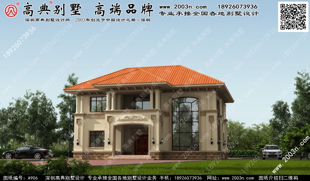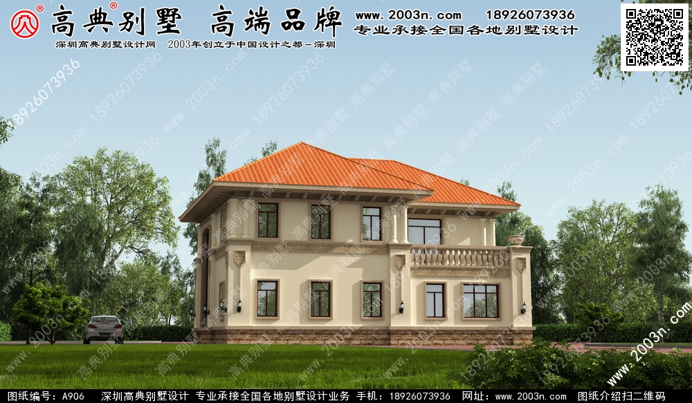 A906号别墅外墙主要材料:真石漆、310X310S瓦、蘑菇面黄锈石、葫芦栏杆、水泥构件斗拱、成品浮雕 |