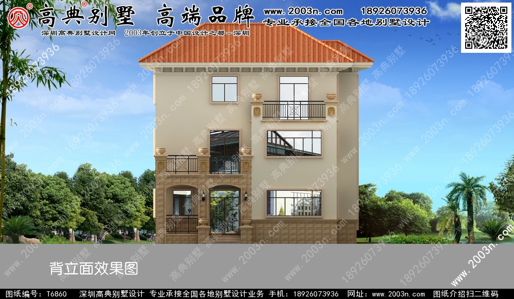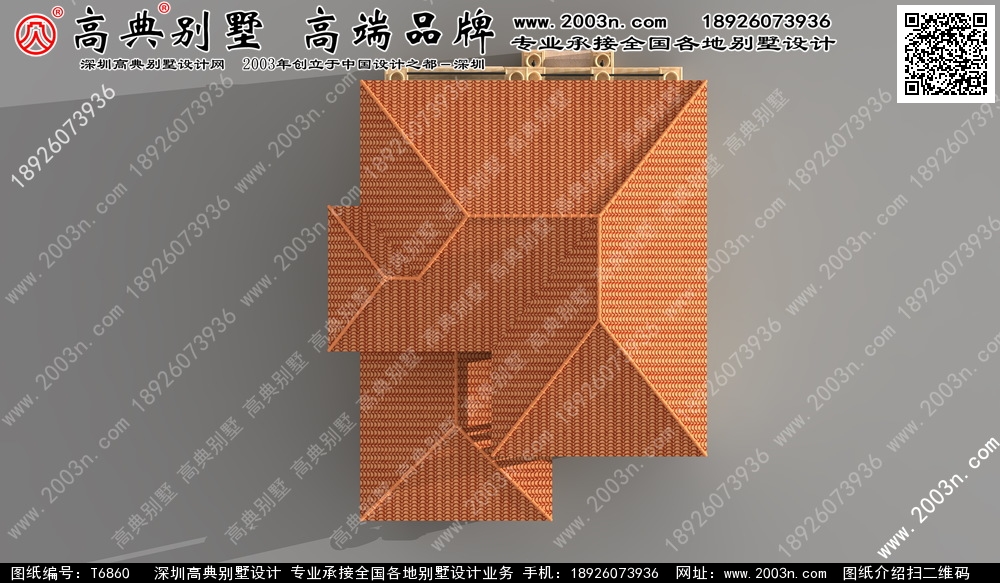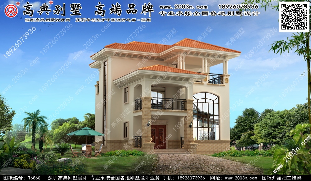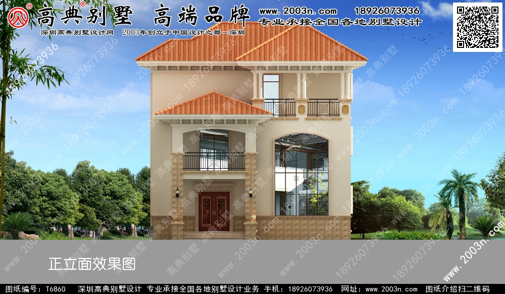 t6860号别墅外墙主要材料:天然岩石漆、天然砂岩石板材、天然砂岩石浮雕、310X310 S瓦、GRC水泥构件、铁艺栏杆