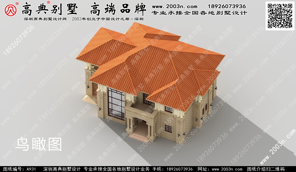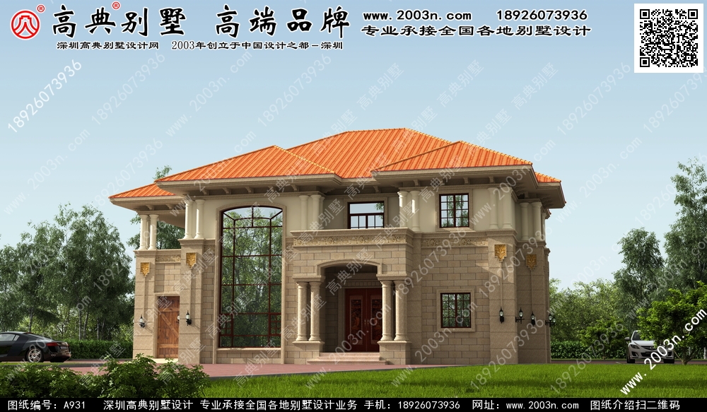 此别墅外墙主要材料:火烧面黄锈石、真石漆、欧式水泥构件圆柱线条浮雕造型、310X310S瓦 |
