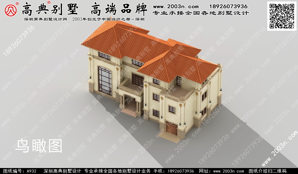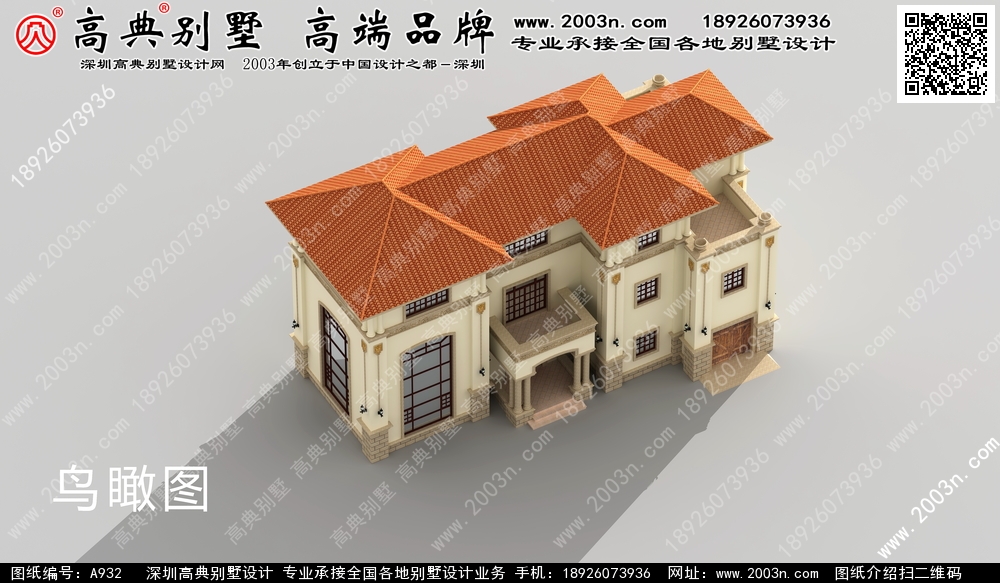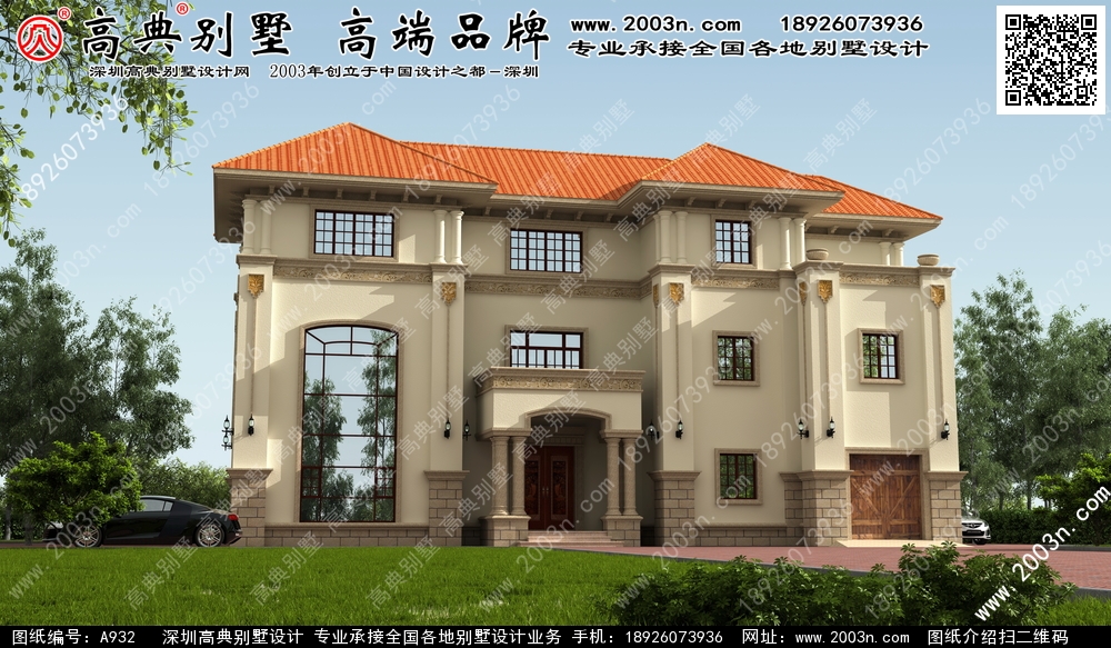 此别墅外墙主要材料:火烧面黄锈石、真石漆、欧式水泥构件圆柱线条浮雕造型、310X310S瓦 |