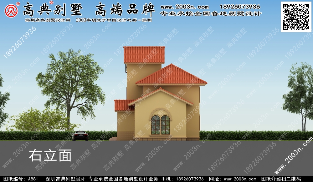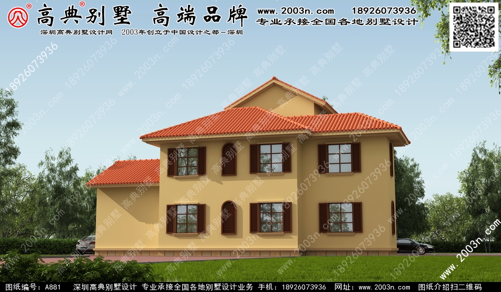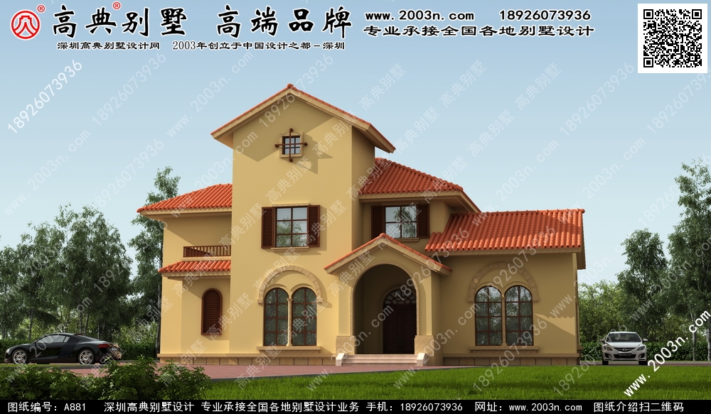 此别墅外墙主要材料:火烧面黄锈石、真石漆、西班牙筒瓦 |