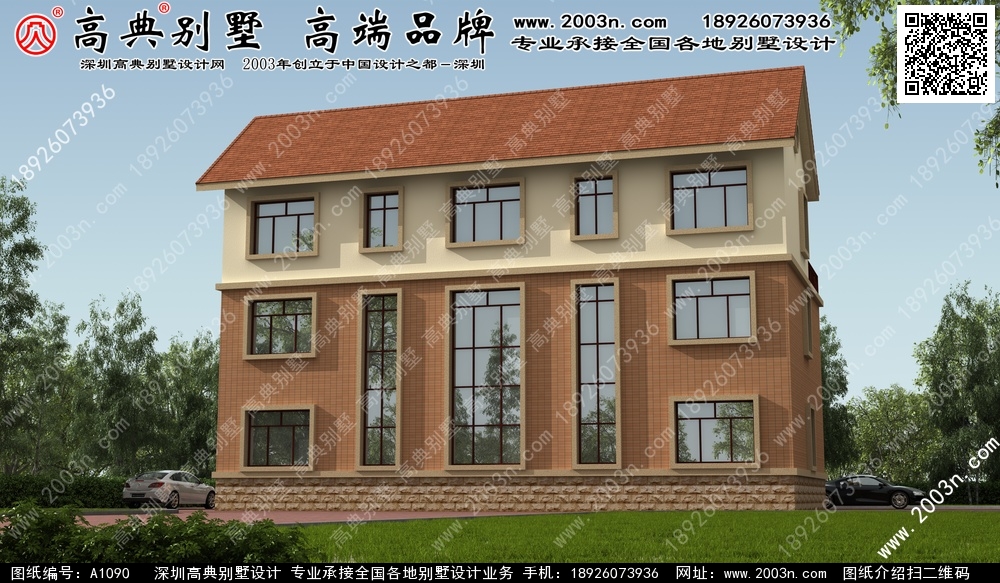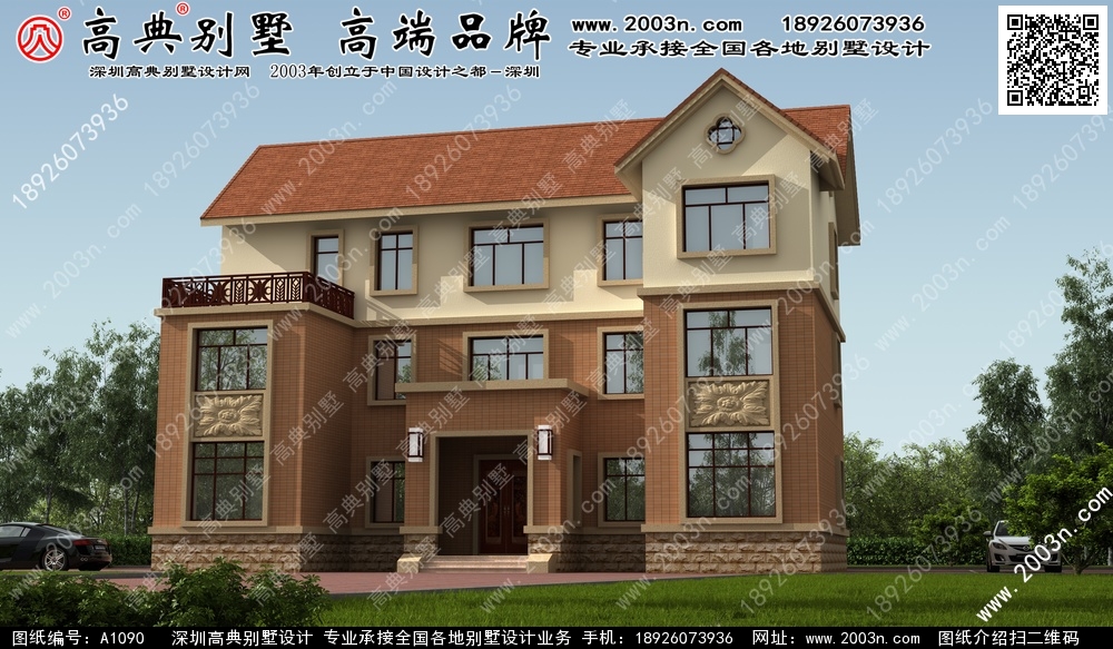 A1090号别墅外墙主要材料:蘑菇面黄锈石、劈开砖、真石漆、、水泥平板瓦、铁艺栏杆 |