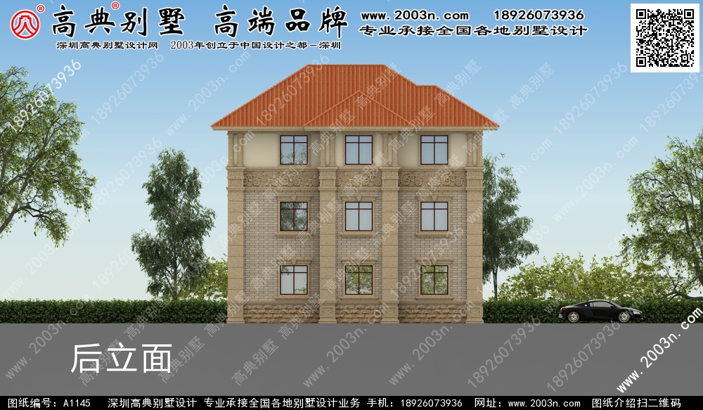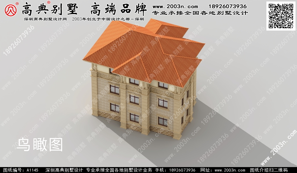 A1145号别墅外墙主要材料:水泥构件、外墙砖、蘑菇面黄锈石、真石漆、屋面310X310S瓦 |