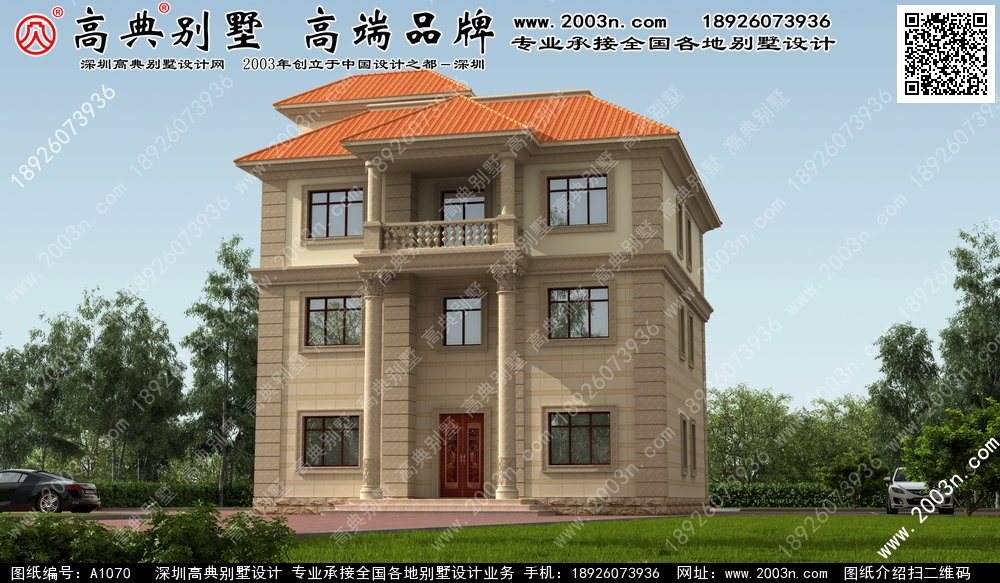 A1070号别墅外墙主要材料:外墙真石漆、外墙砖、葫芦柱栏杆、水泥构件、墙脚蘑菇面黄锈石、310X310S瓦