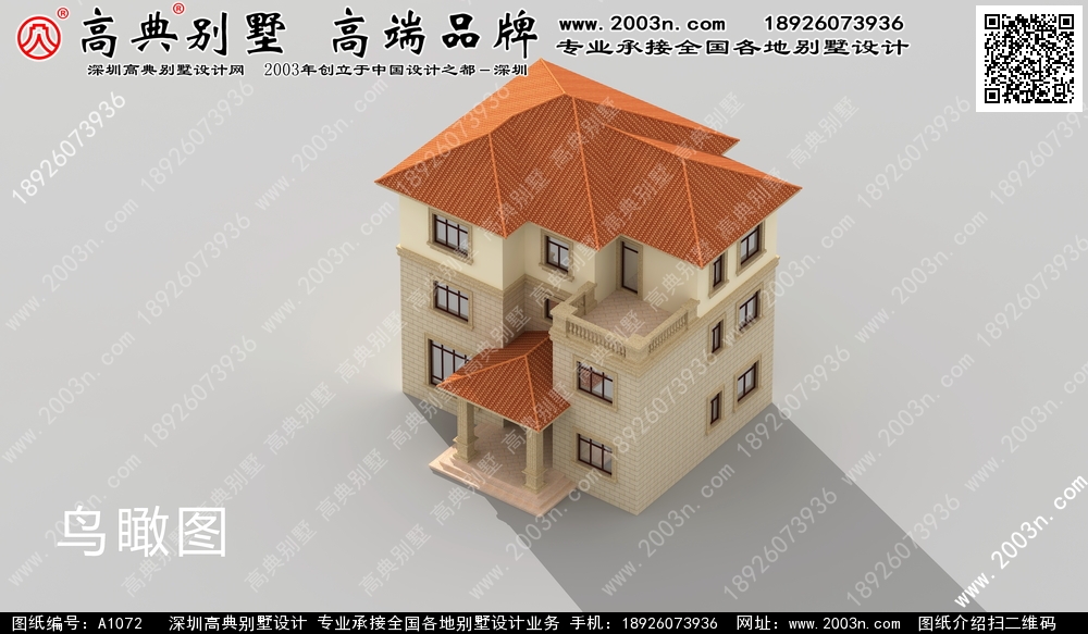 A1072号别墅外墙主要材料:真石漆、外墙砖、水泥构件、葫芦柱栏杆、310X310S瓦 |