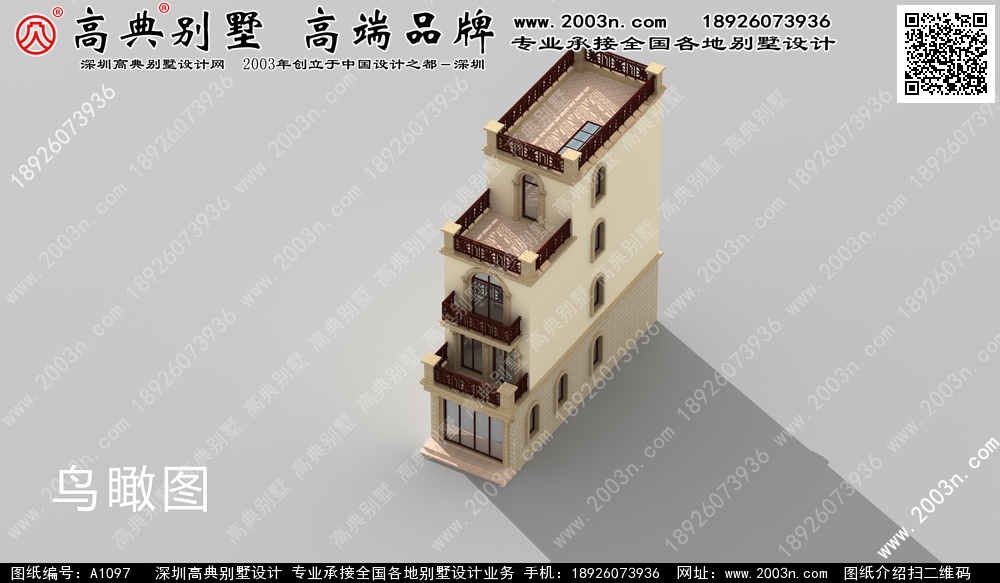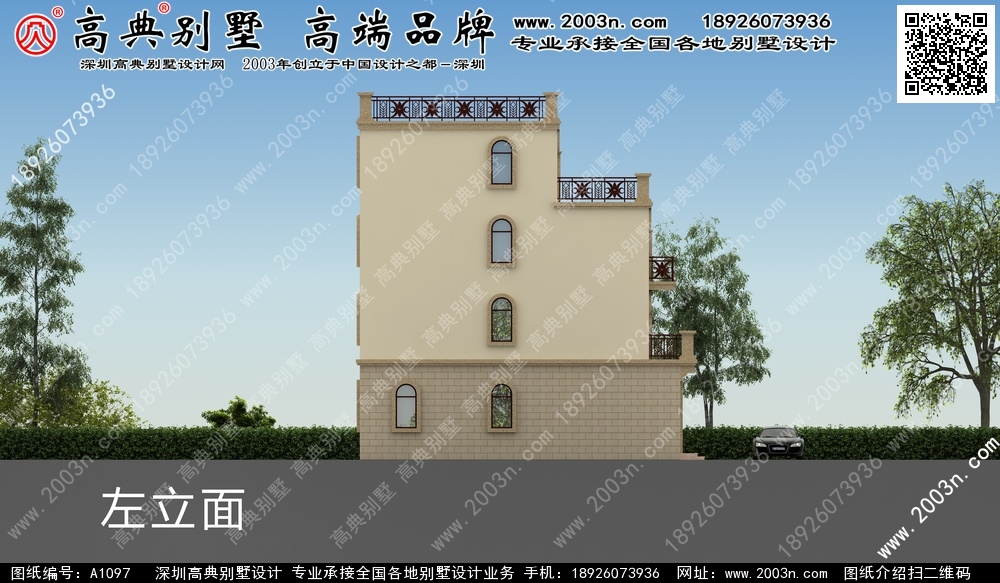 A1097号别墅外墙主要材料:外墙砖、铁艺栏杆、天然岩石漆 |