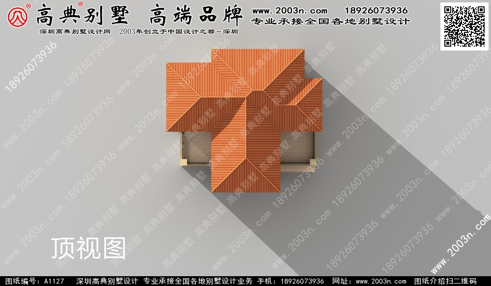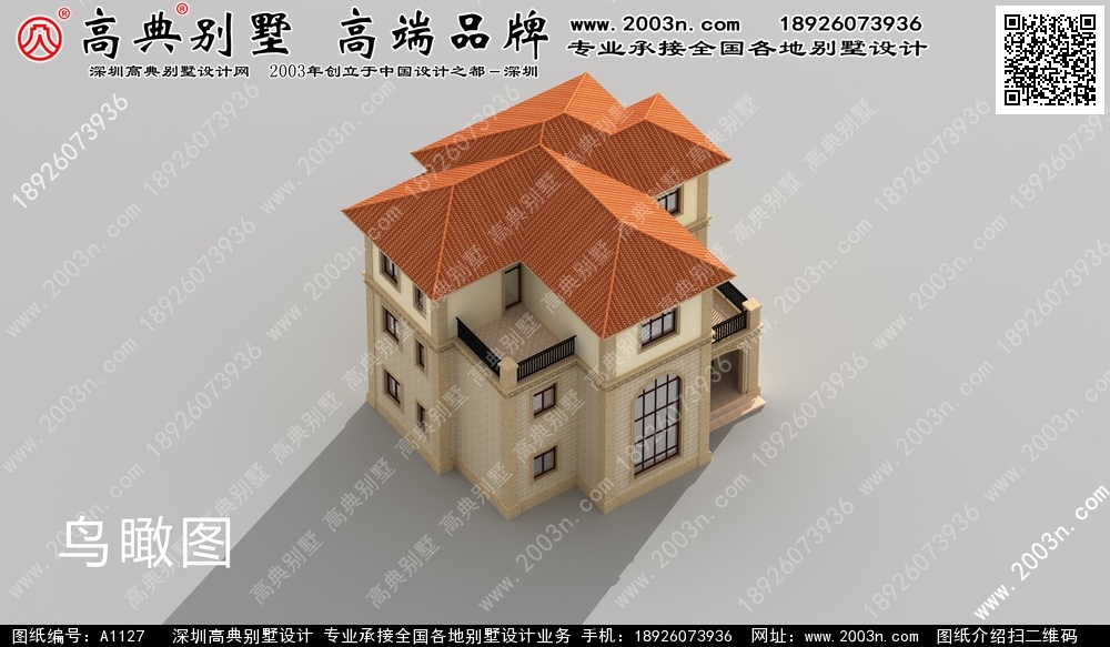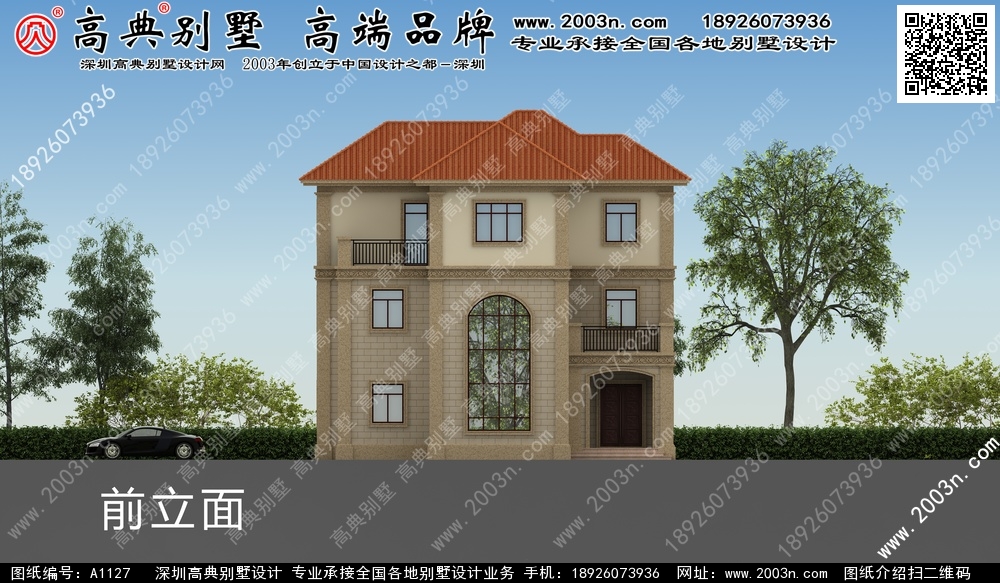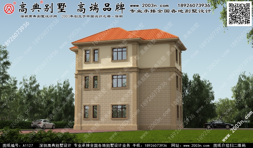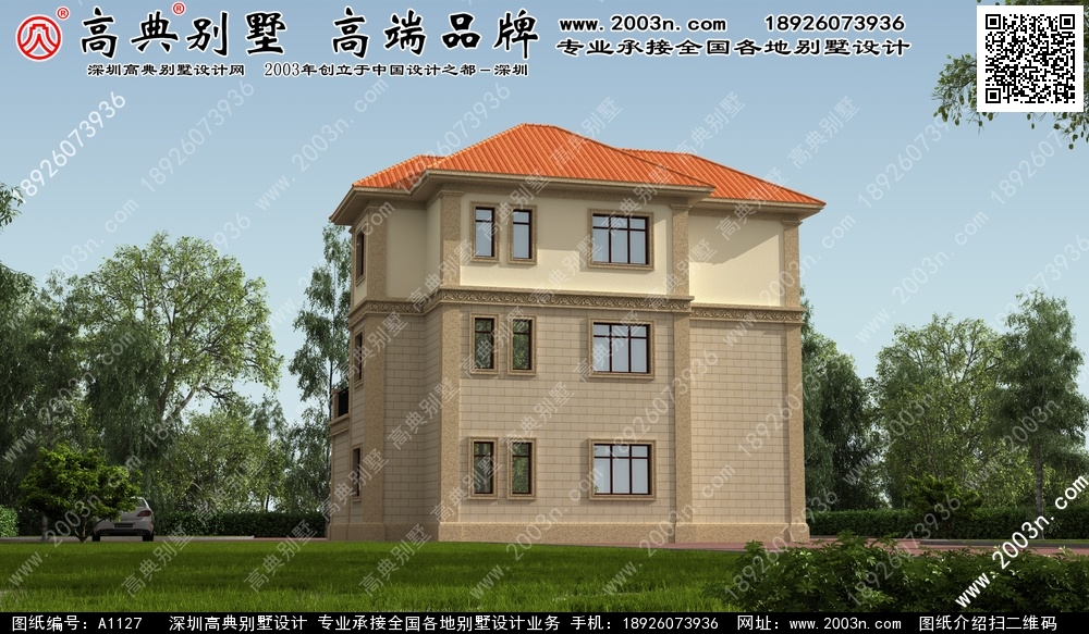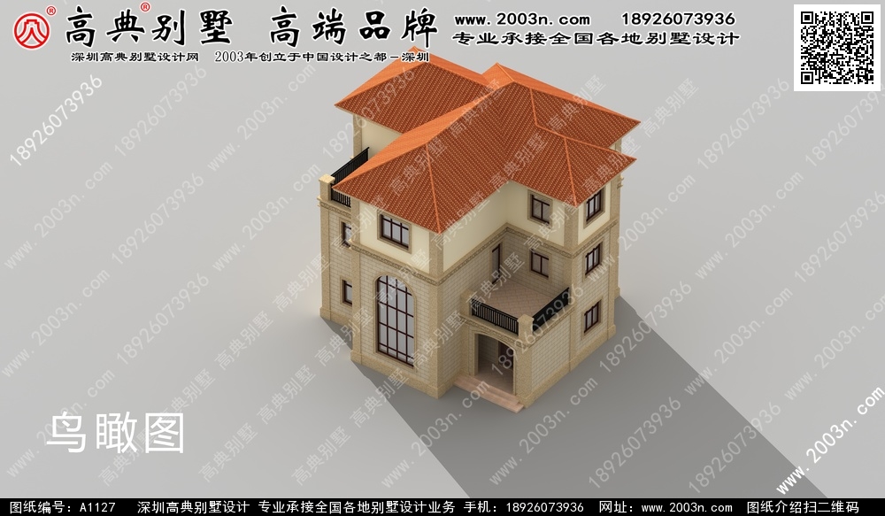 A1127号别墅外墙主要材料:真石漆、面贴火烧面黄锈石、铁艺栏杆、310X310S瓦