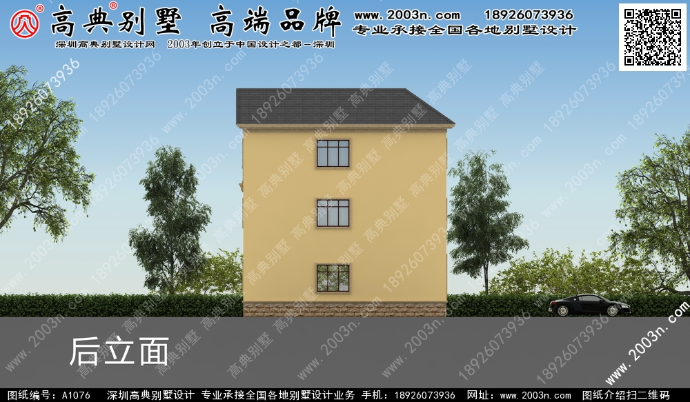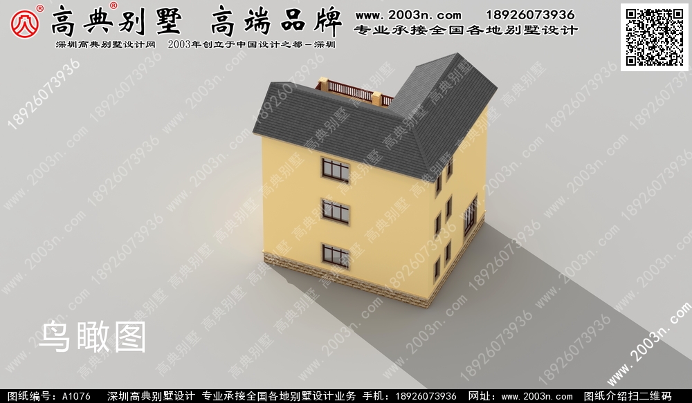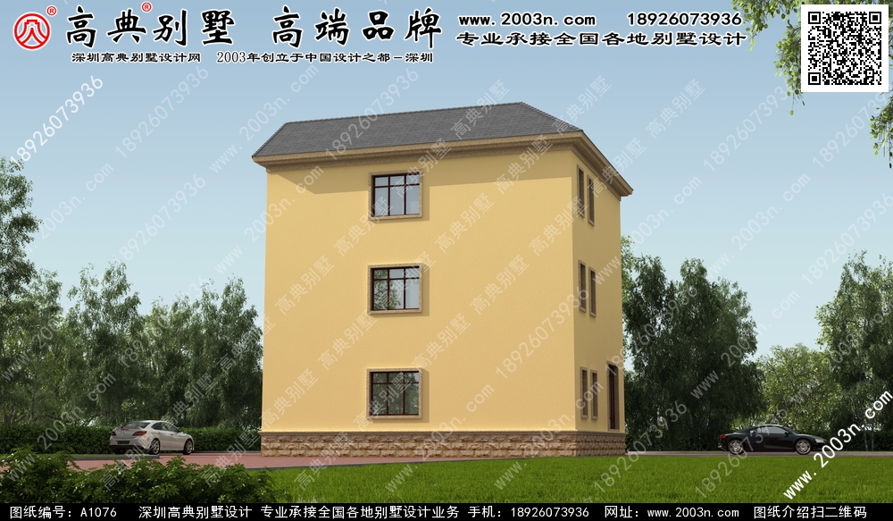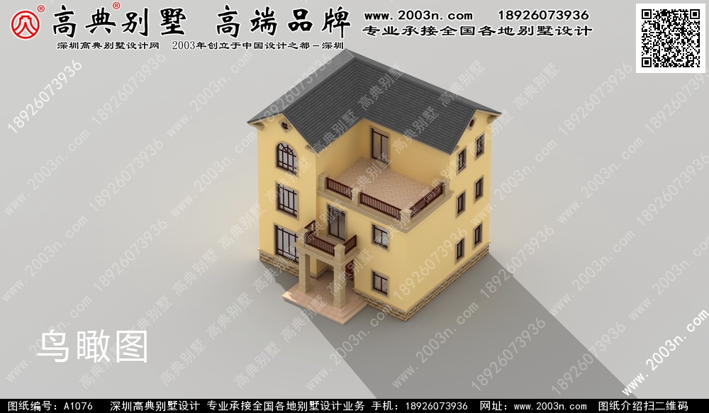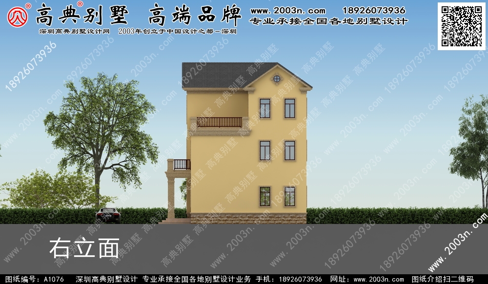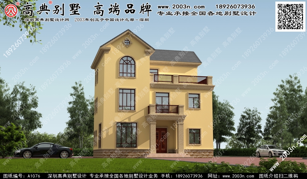 A1076号别墅外墙主要材料:真石漆、蘑菇面黄锈石、铁艺栏杆、水泥构件线条、310X310S瓦