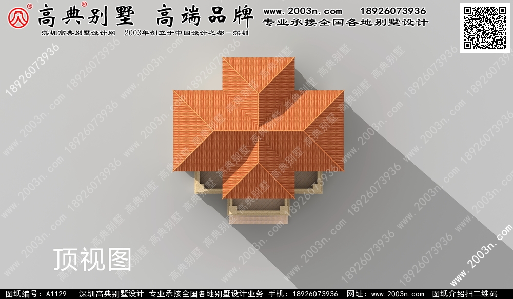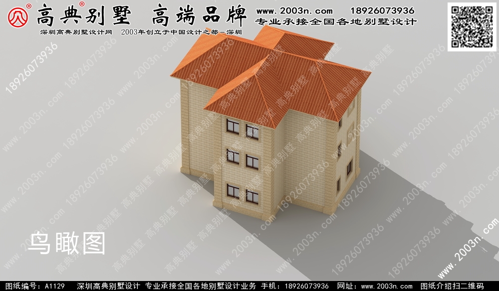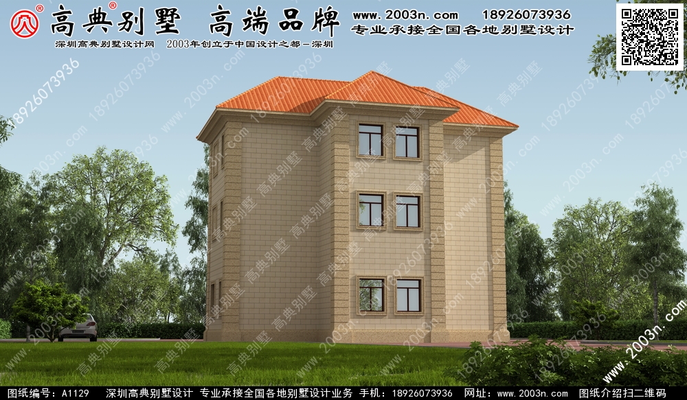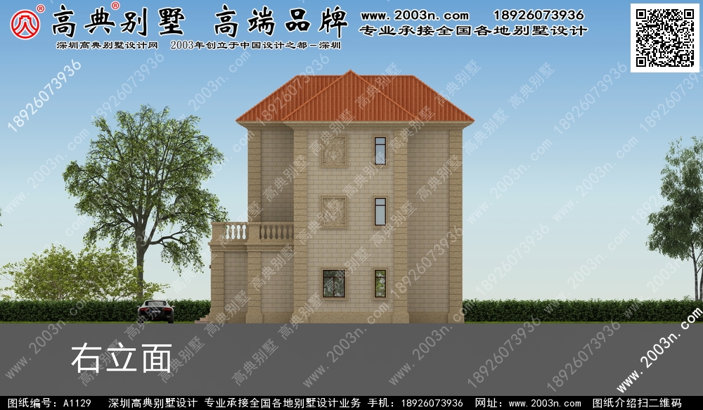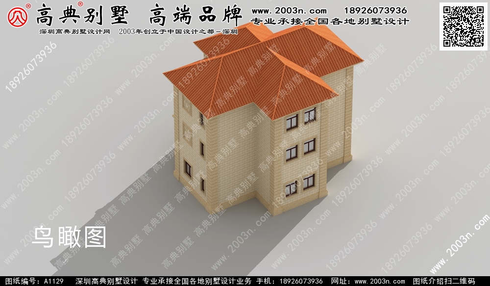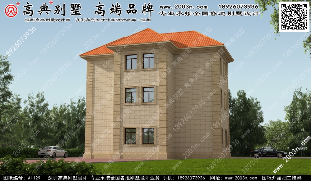 A1129号别墅外墙主要材料:真石漆、外墙欧式水泥构件、面贴火烧面黄锈石、310X310S瓦 |
