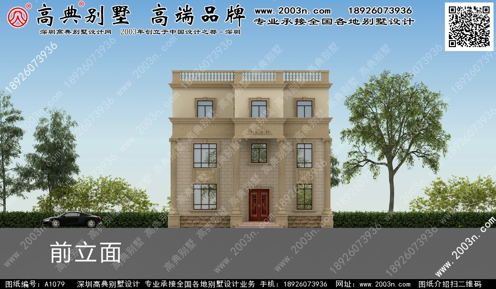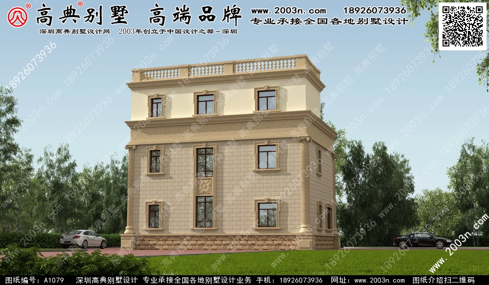 A1079号别墅外墙主要材料:真石漆、葫芦柱栏杆、水泥构件、蘑菇面黄锈石