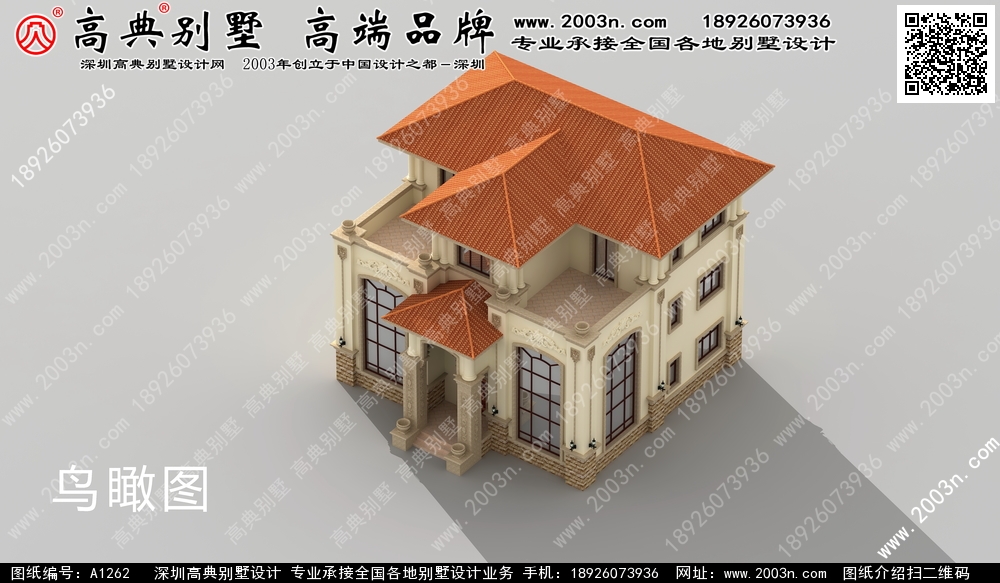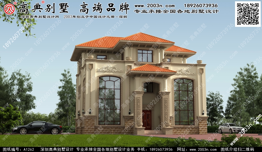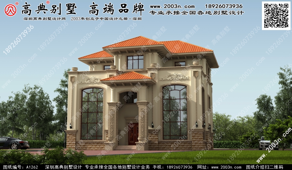 A1262号别墅外墙主要材料:墙脚蘑菇石、外墙真石漆、外墙欧式水泥构件线条及装饰柱、屋面310X310S瓦