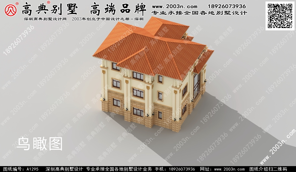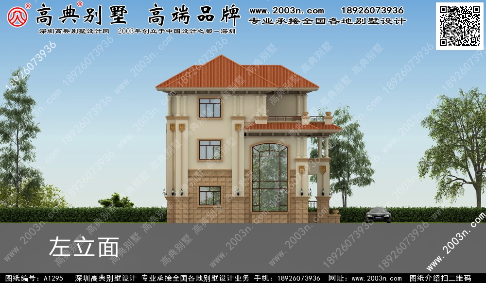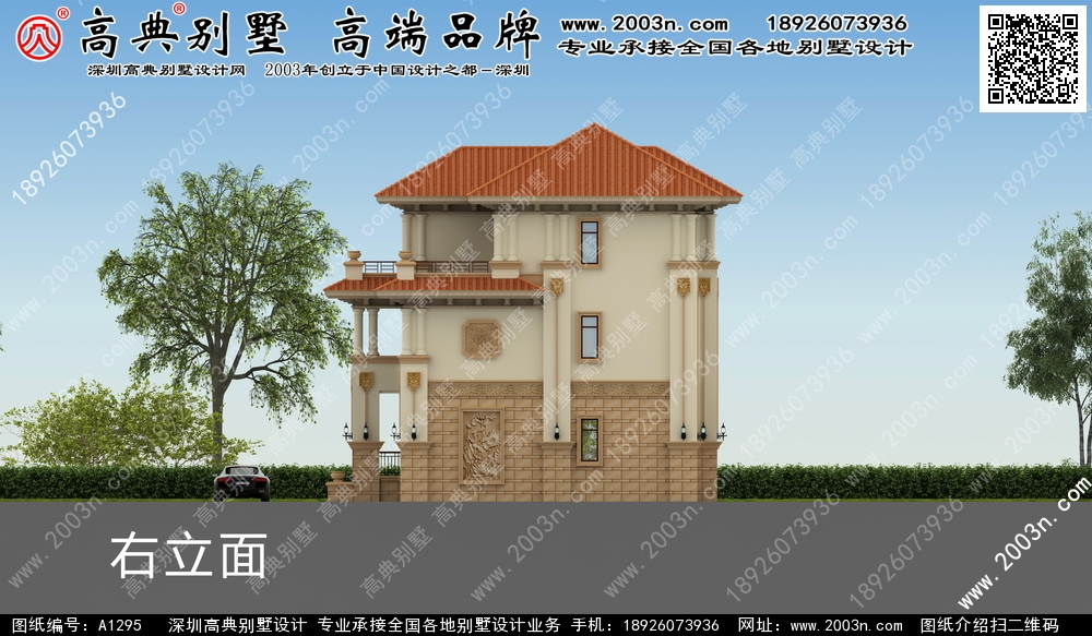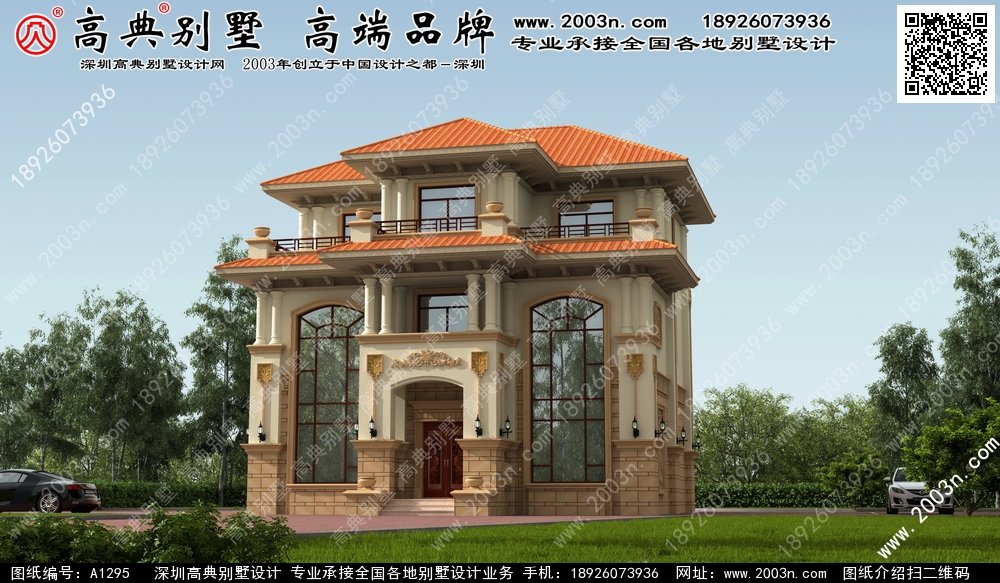 A1295号别墅外墙主要材料:外墙真石漆、外墙欧式水泥构件线条及装饰柱、屋面310X310S瓦