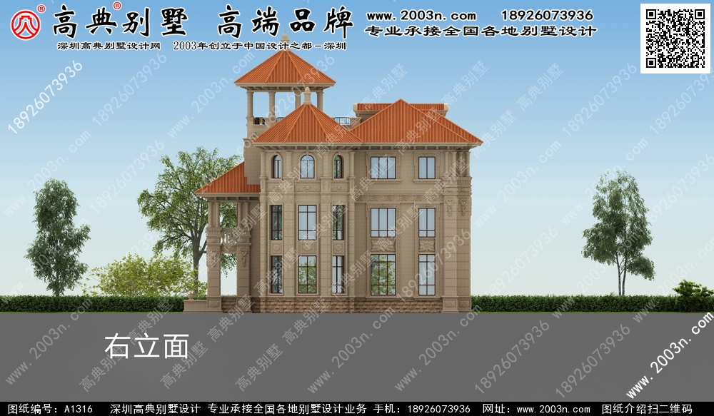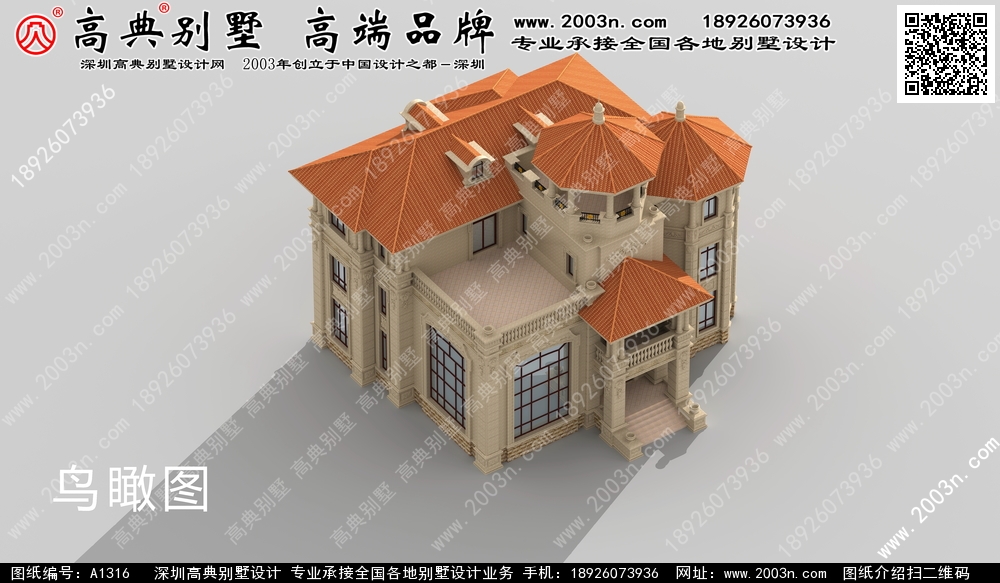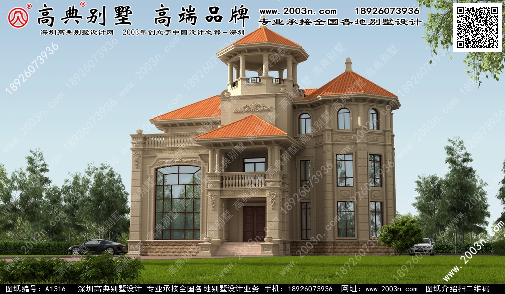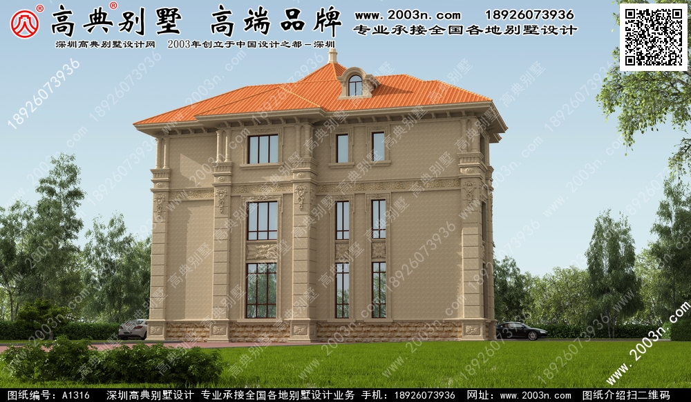A1316号别墅外墙主要材料:真石漆、欧式水泥构件浮雕及线条、310X310S瓦 |