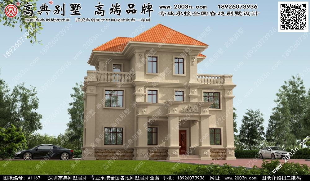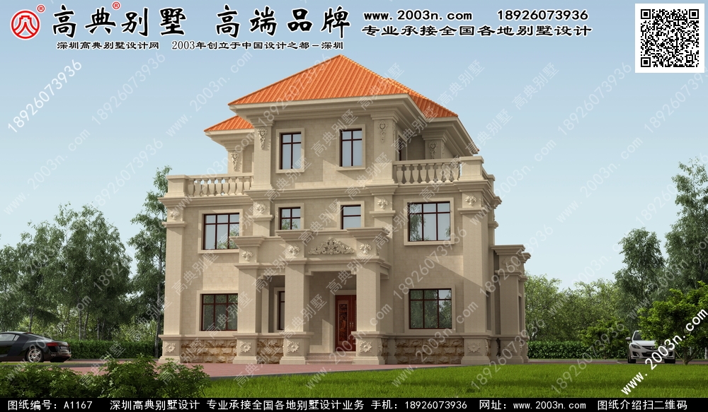A1167号别墅外墙主要材料:水泥构件、蘑菇面黄锈石、真石漆、310X310S瓦 |