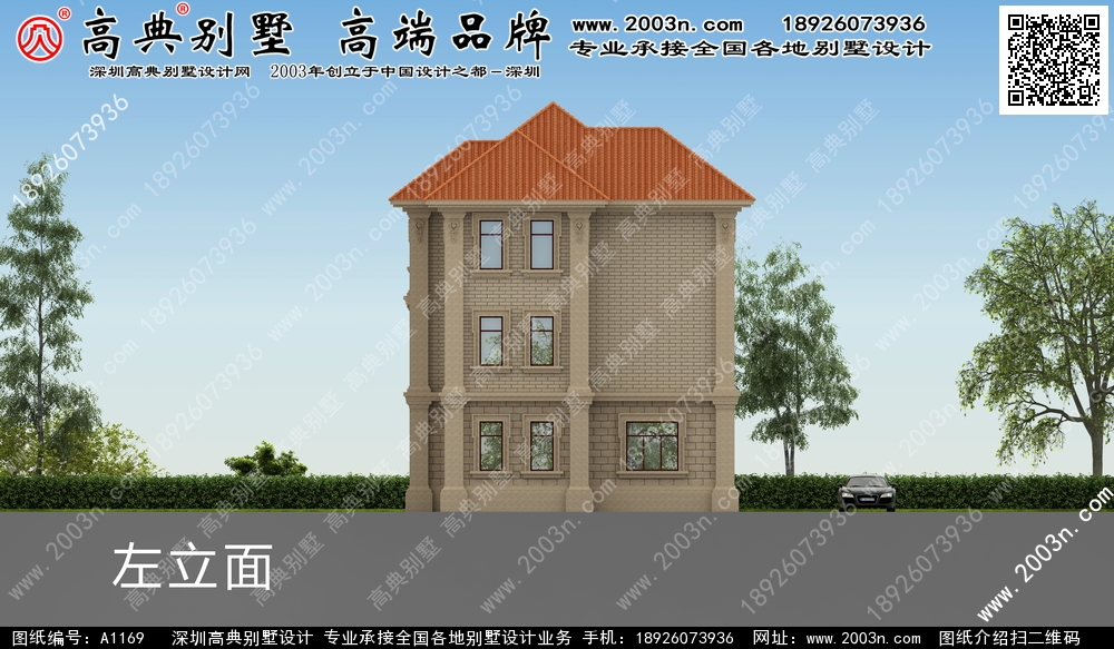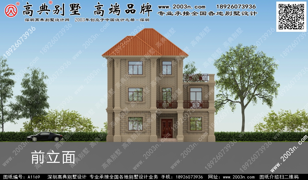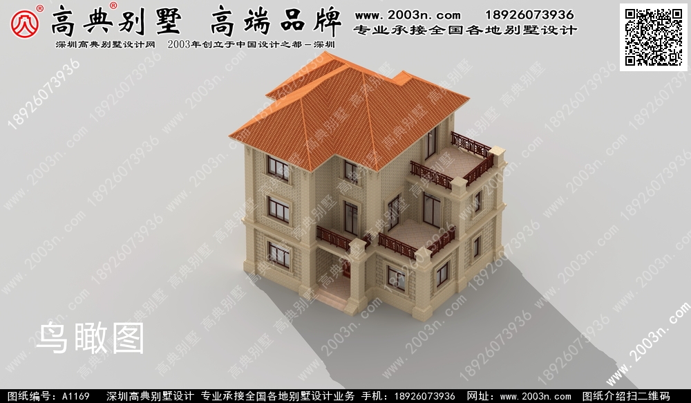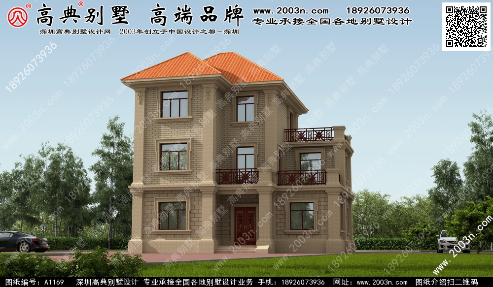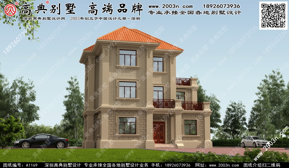 A1169号别墅外墙主要材料:水泥构件、荔枝面黄锈石、劈开砖、真石漆、310X310S瓦 |