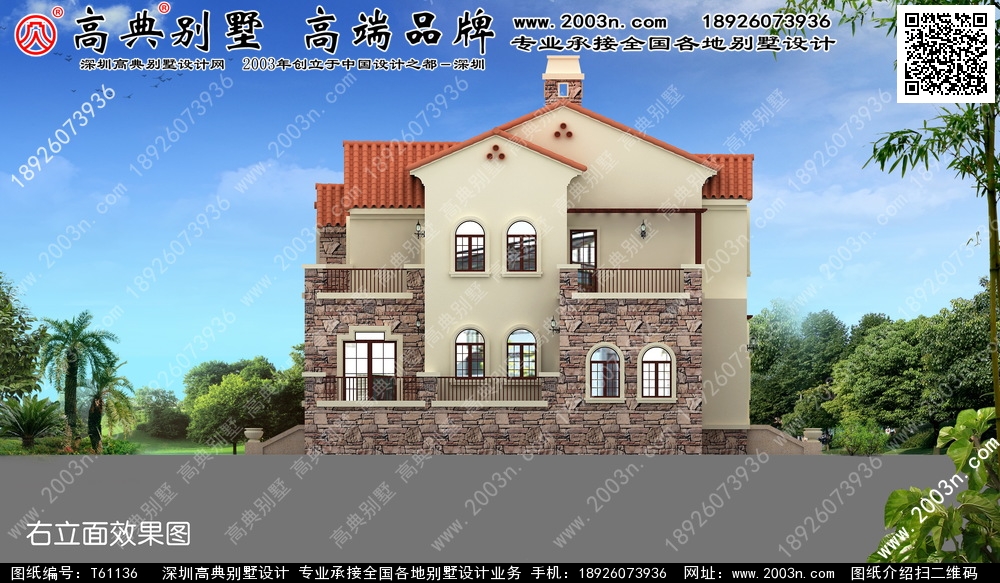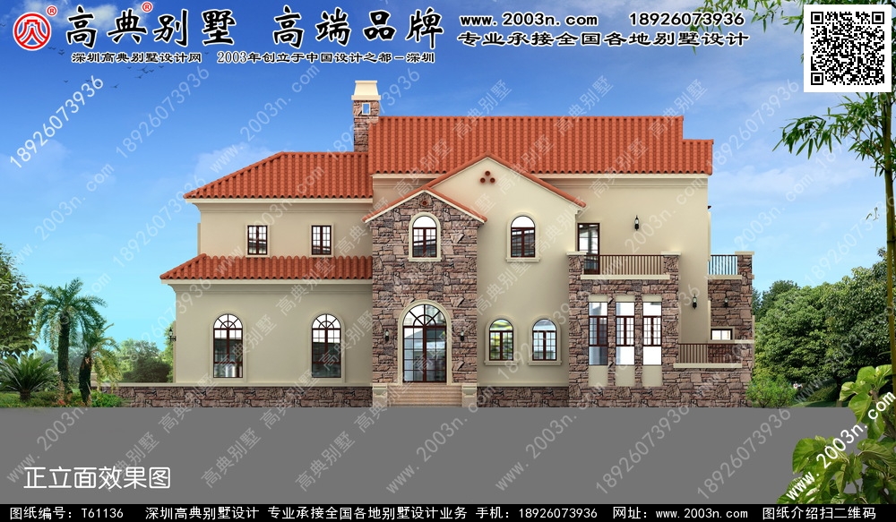 T61136号别墅外墙主要材料:真石漆、西班牙筒瓦、外墙文化石