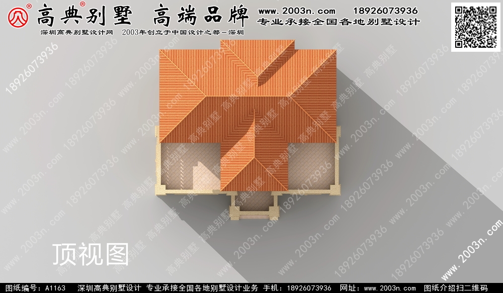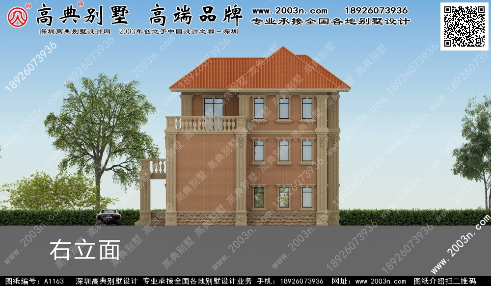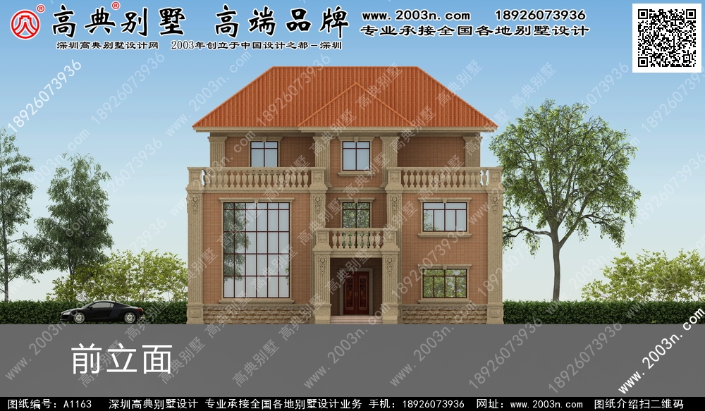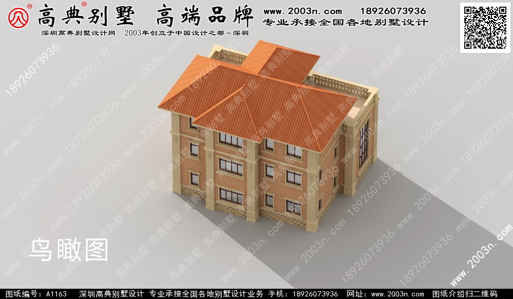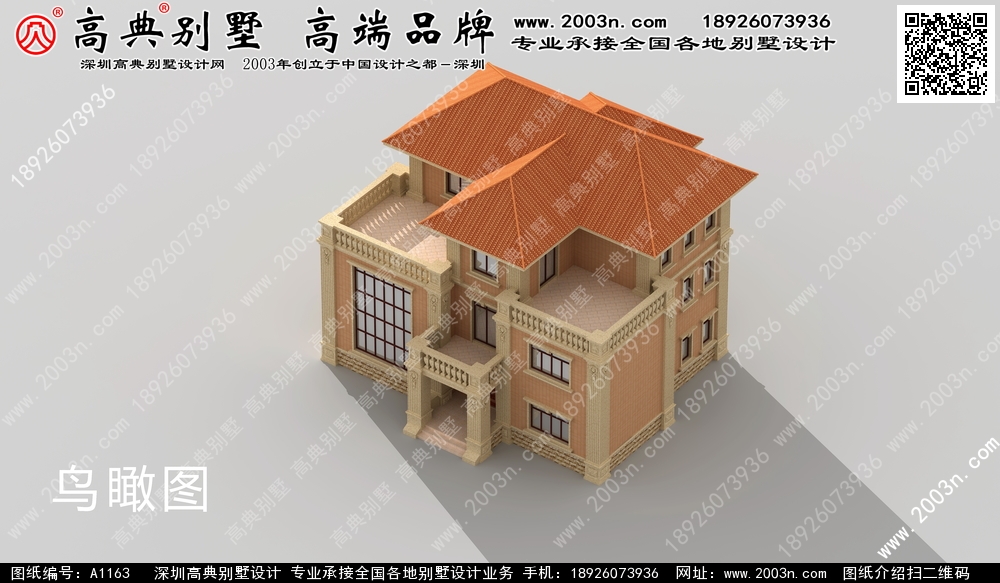 A1163号别墅外墙主要材料:水泥构件、蘑菇面黄锈石、劈开砖、真石漆、310X310S瓦 |
