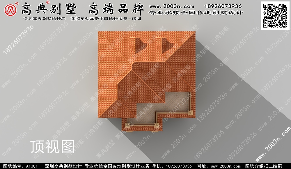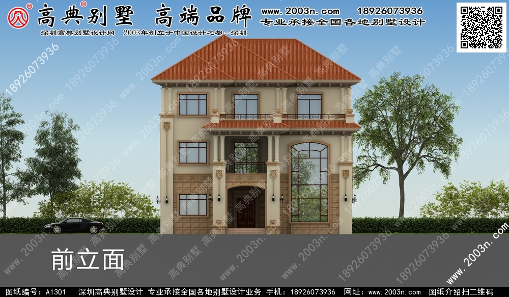 A1301号别墅外墙主要材料:砂岩石、真石漆、天然砂岩石浮雕、310X310 S瓦、GRC水泥构件、铁艺栏杆 |