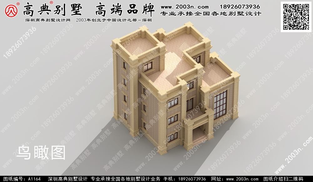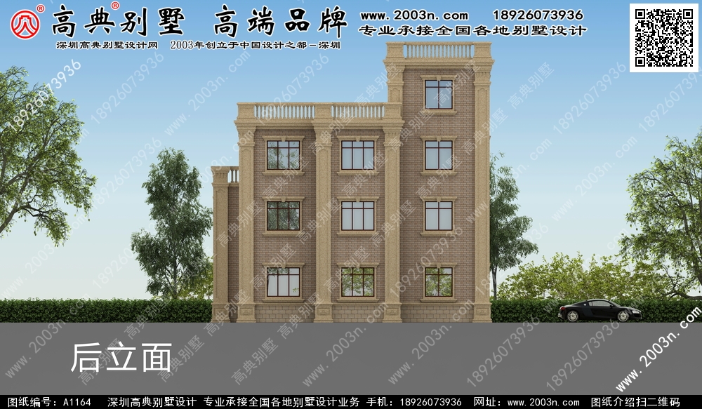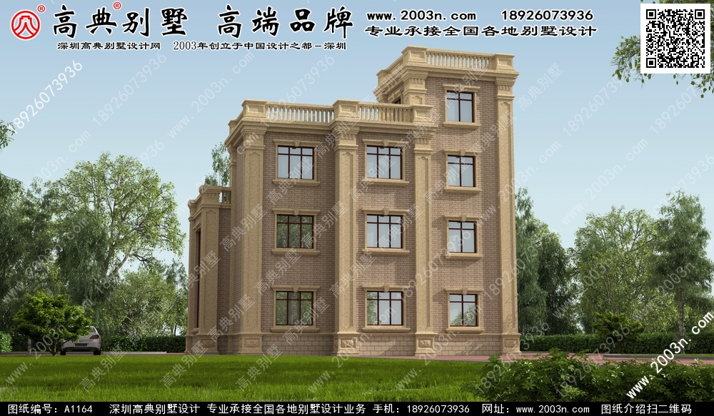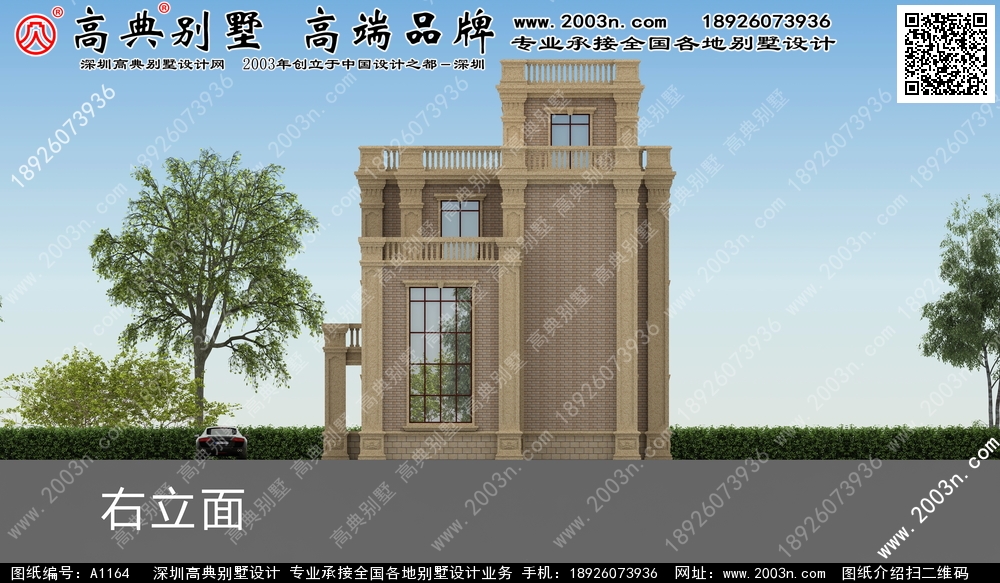 A1164号别墅外墙主要材料:荔枝面黄锈石、劈开砖、真石漆 |