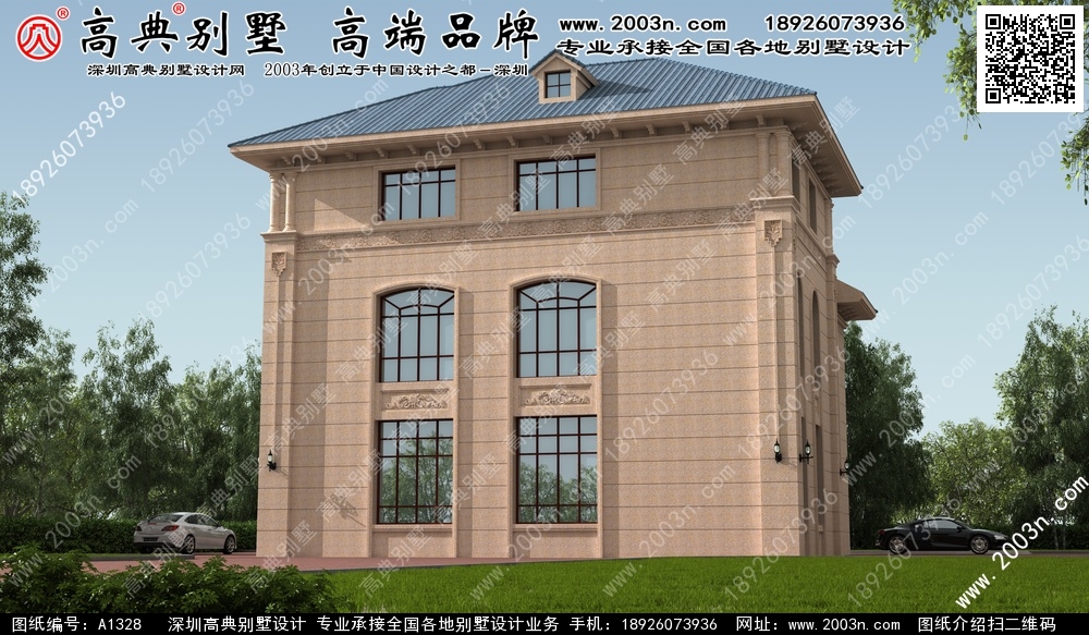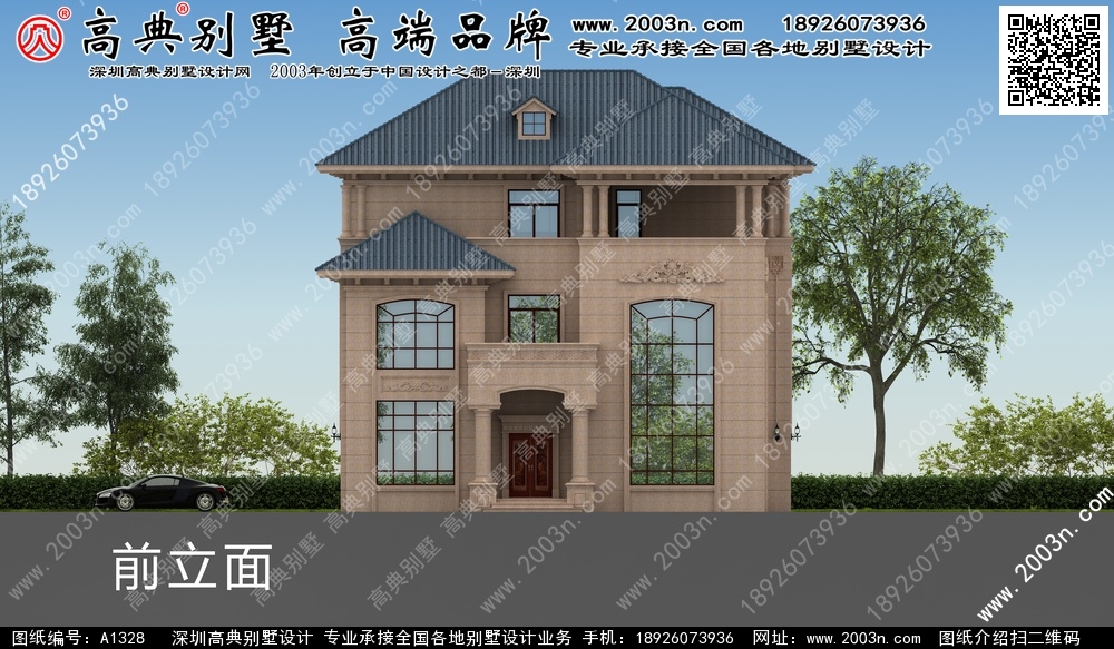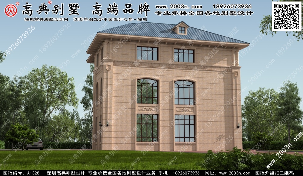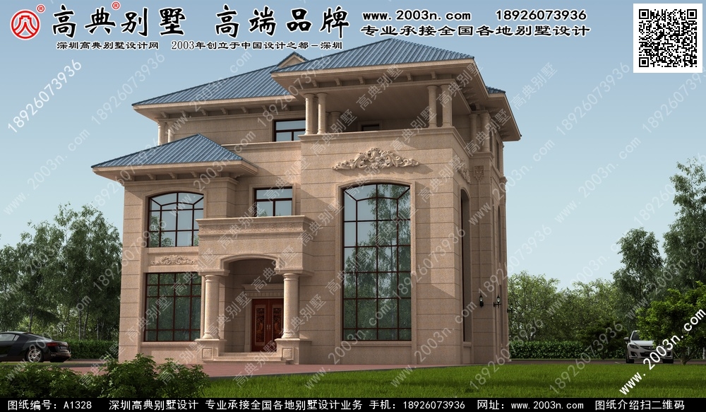 A1328号别墅外墙主要材料:S瓦、荔枝面永定红石材、石材雕刻 |