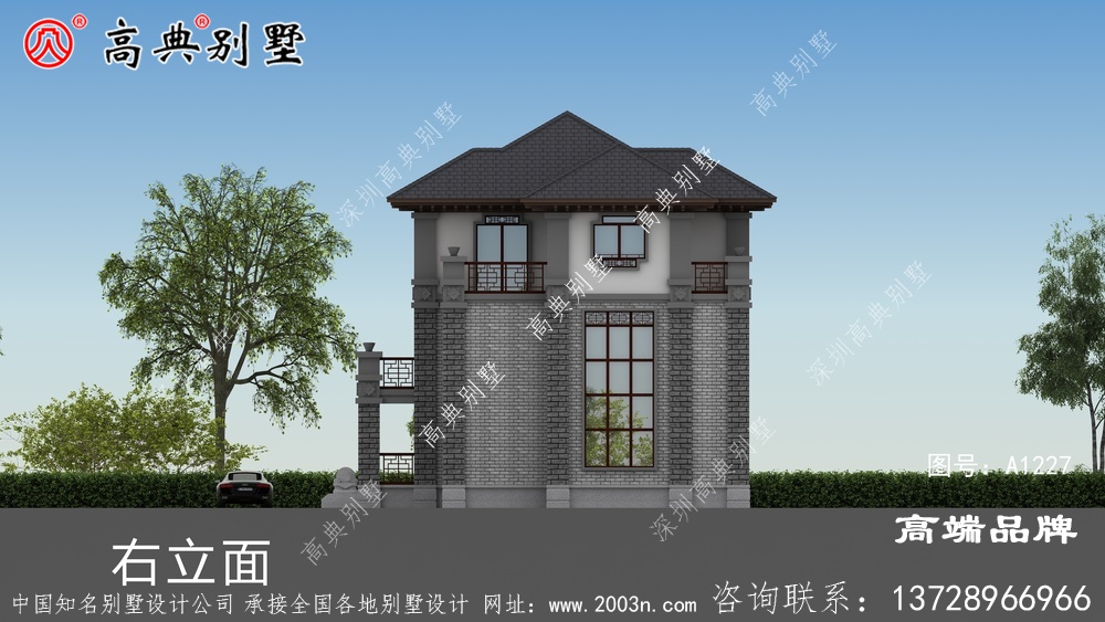 A1227号别墅外墙材料:水泥平板瓦、真石漆、仿古青砖、麻石