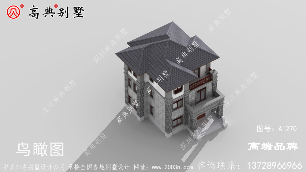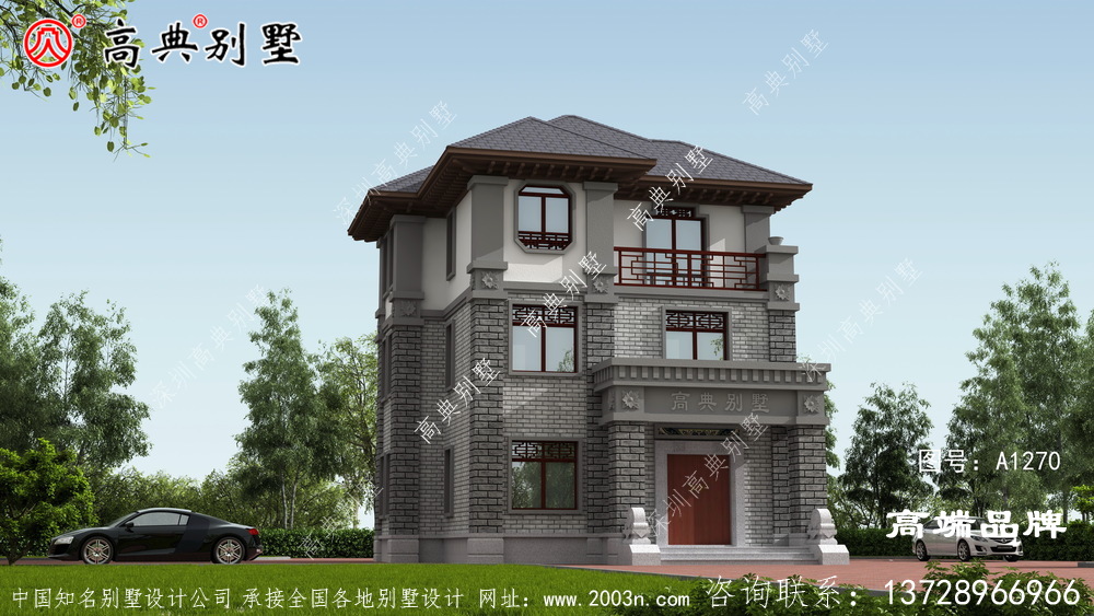 A1270号别墅外墙主要材料:水泥平板瓦、真石漆、仿古青砖、麻石
