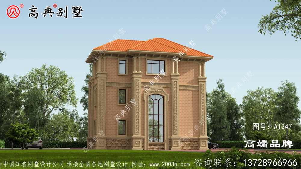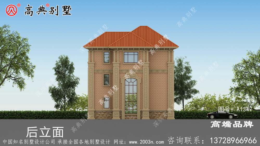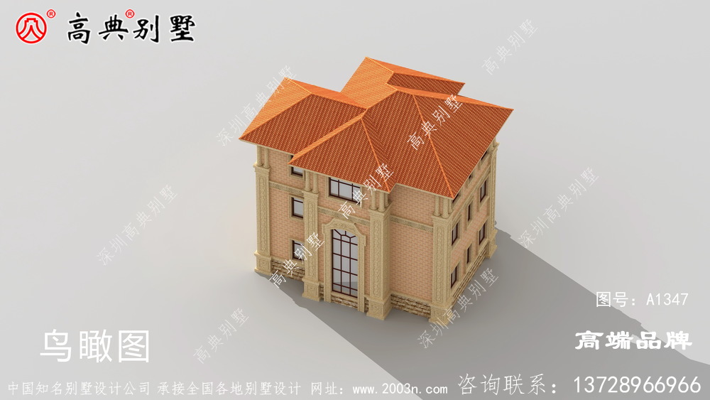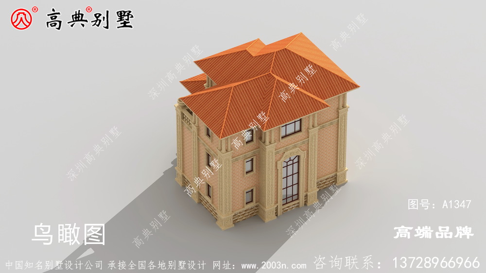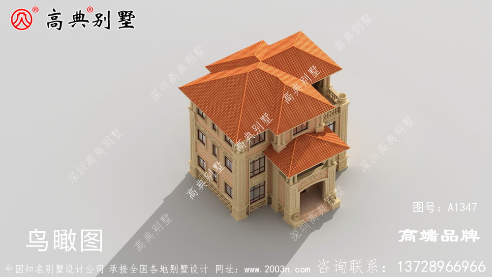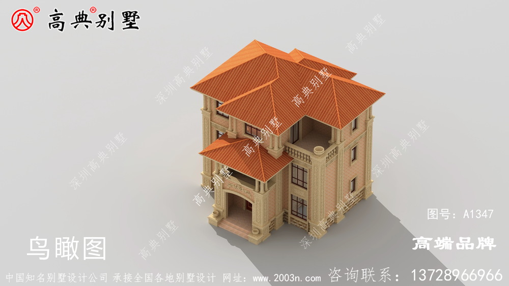 A1347号别墅外墙主要材料:蘑菇面黄锈石、砂岩石、真石漆、310X310S瓦、GRC水泥构件、葫芦柱栏杆