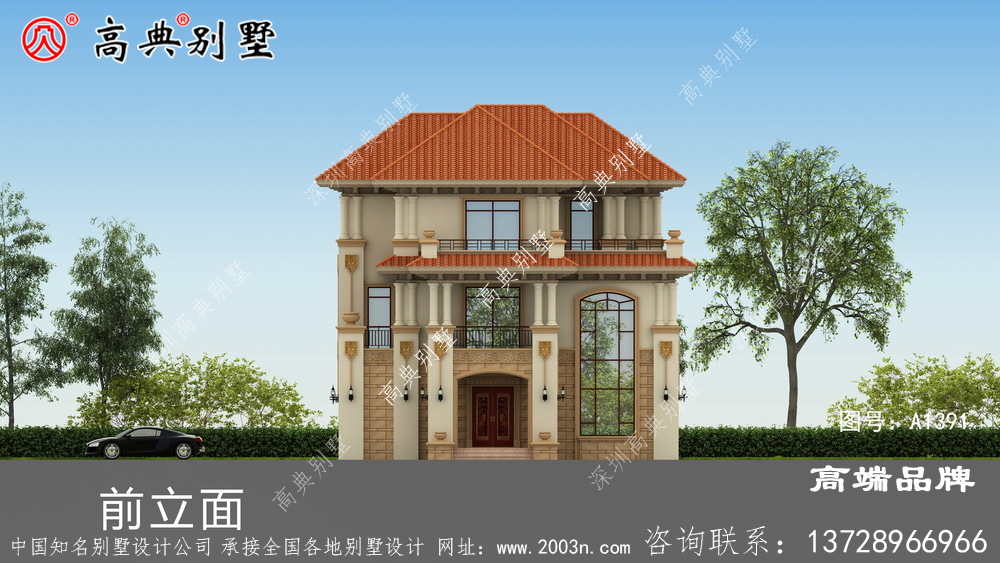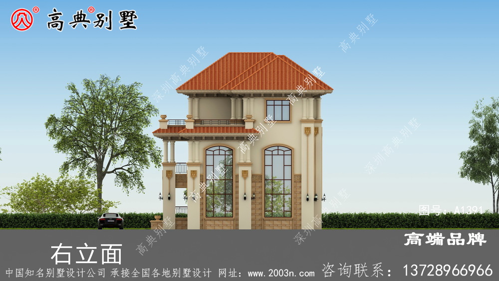 A1391号别墅外墙主要材料:砂岩石、真石漆、天然砂岩石浮雕、310X310 S瓦、GRC水泥构件、铁艺栏杆