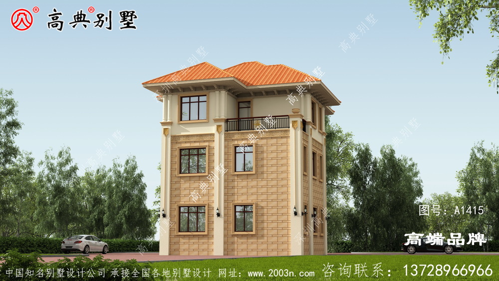 A1415号别墅外墙主要材料:砂岩石、真石漆、天然砂岩石浮雕、310X310 S瓦、GRC水泥构件、铁艺栏杆
