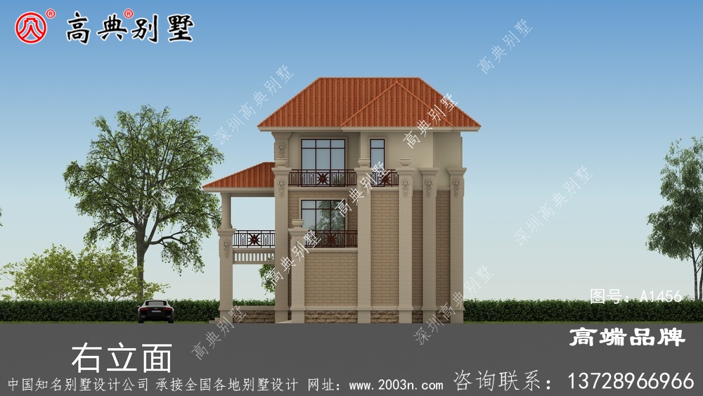 A1456号别墅外墙主要材料:蘑菇面黄锈石、劈开砖、真石漆、铁艺栏杆、310X310S瓦