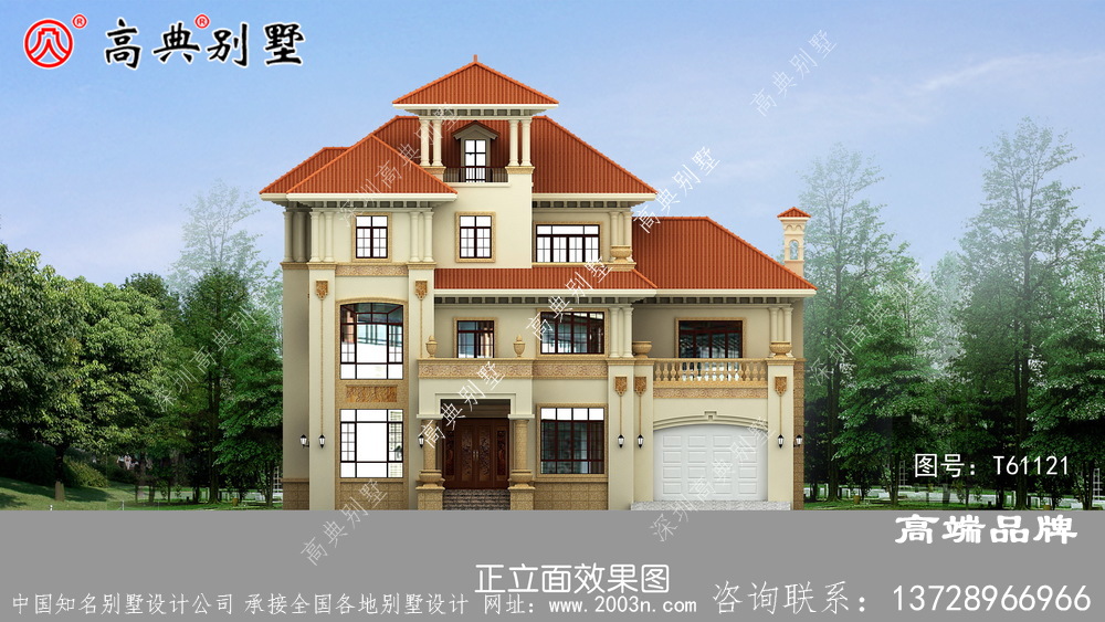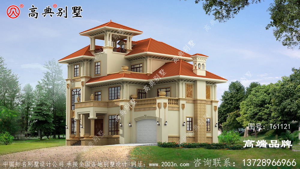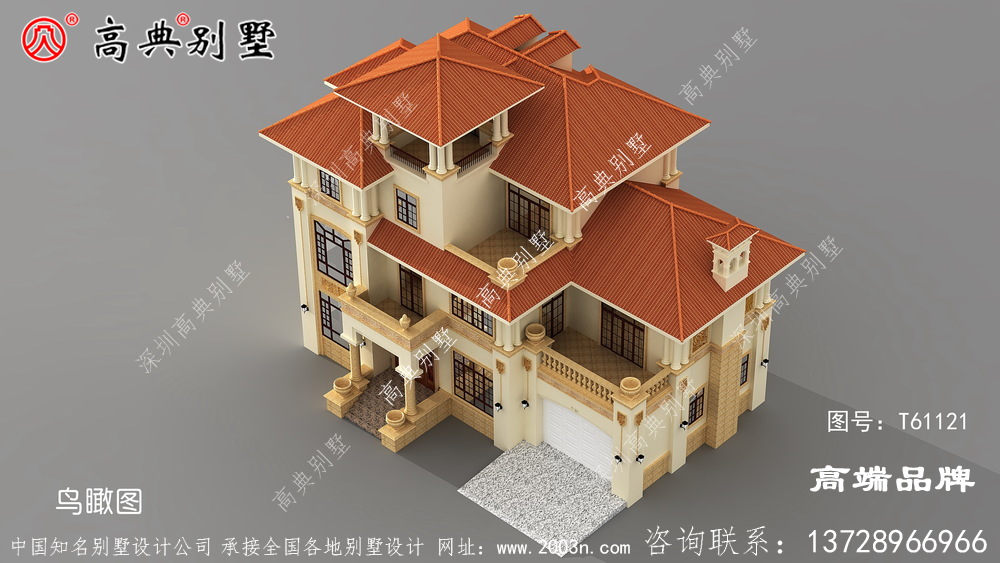 t61121号别墅外墙主要材料:天然岩石漆、天然黄锈石板材、天然砂岩石浮雕、300X300 S瓦、GRC水泥构件 |