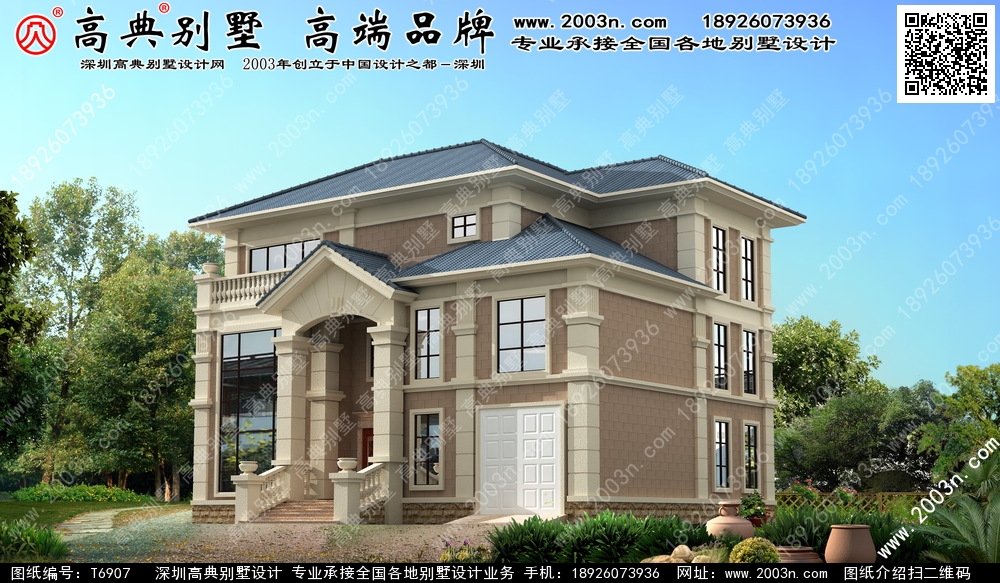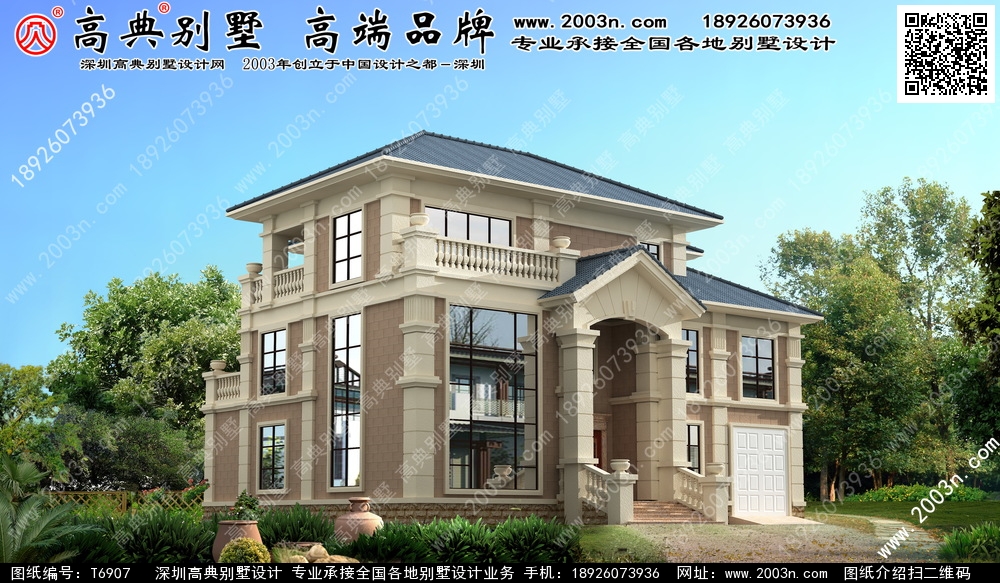 t6907号别墅外墙主要材料:外墙真石漆、仿石材外墙砖、S瓦、GRC水泥葫芦柱、GRC构件包边、蘑菇石
