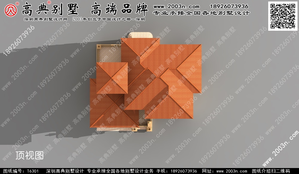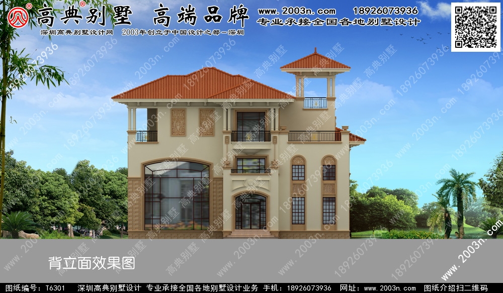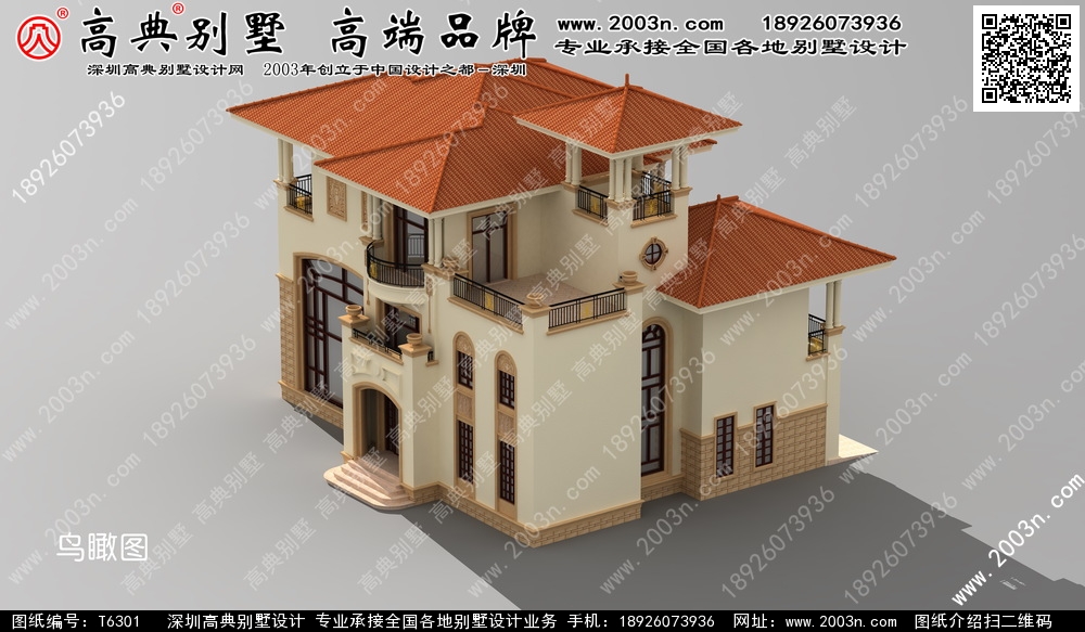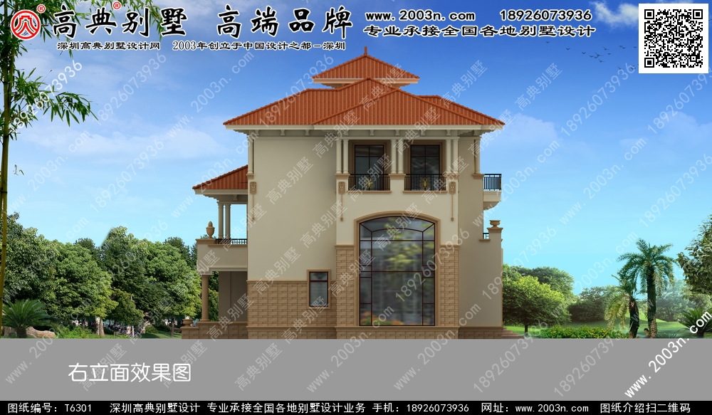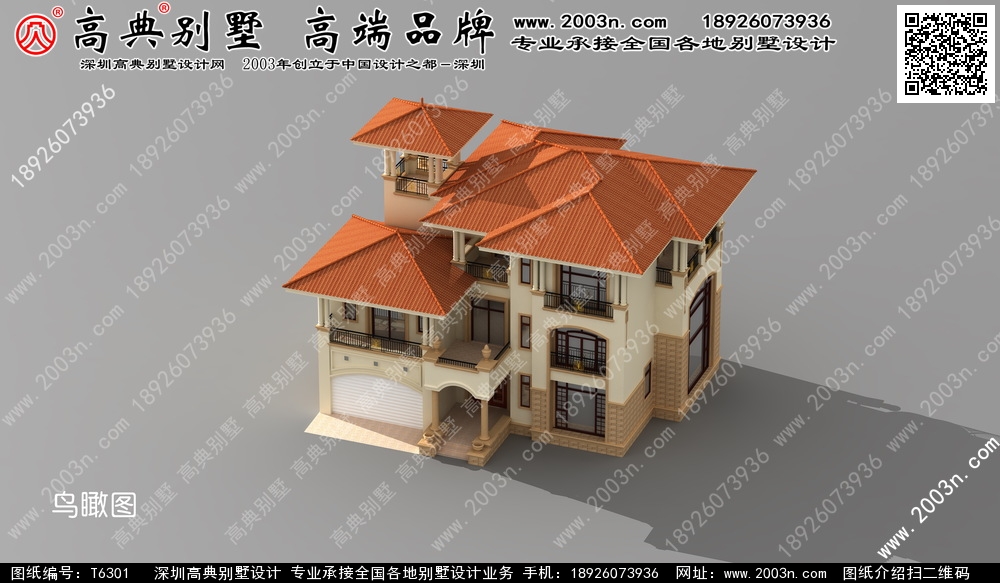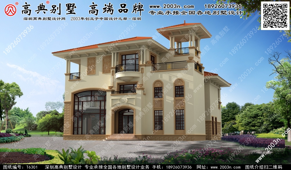 T6301号别墅外墙主要材料:外墙涂料、GRC水泥构件、西瓦、砂岩石 |