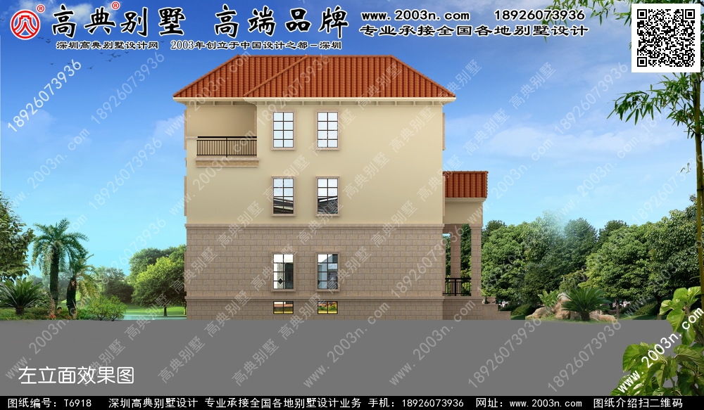 t6918号别墅外墙主要材料:外墙涂料、西瓦、铁艺栏杆、仿石材外墙砖、天然砂岩石浮雕