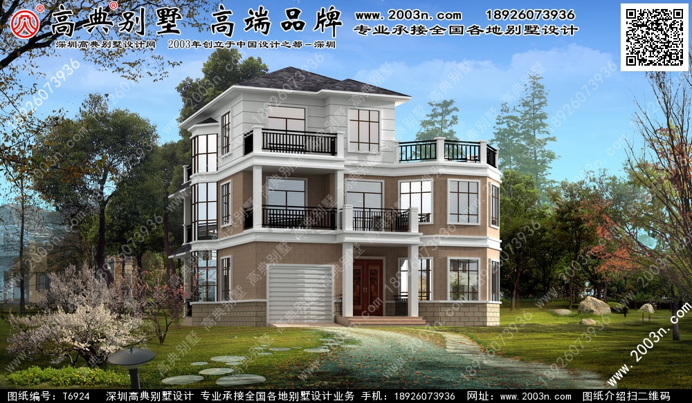 t6924号别墅外墙主要材料:外墙真石漆、屋面玻纤瓦、墙裙蘑菇石
