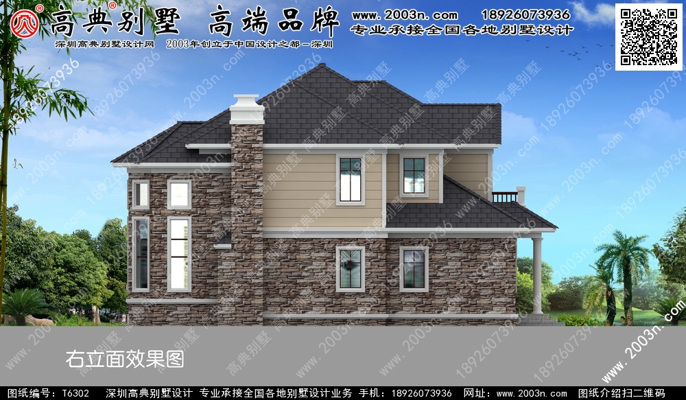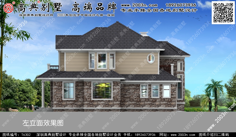 T6302号别墅外墙主要材料:外墙涂料、外墙文化石、水泥平板瓦 |