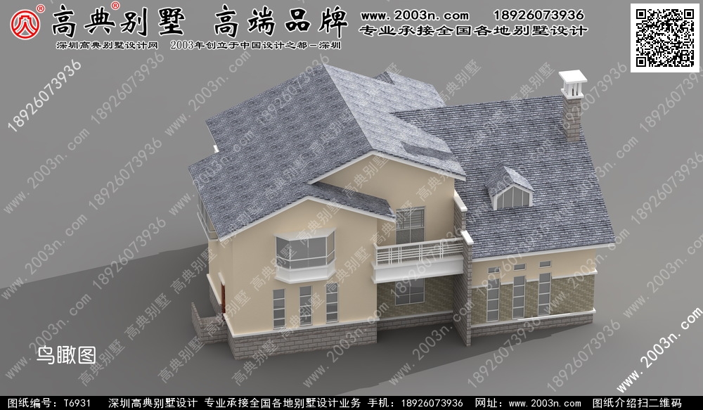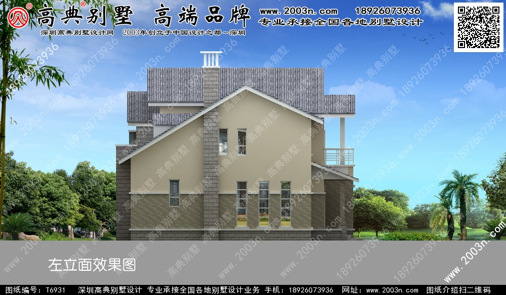 t6931号别墅外墙主要建筑材料:天然岩石漆、外墙砖、水泥平板瓦、铁艺栏杆
