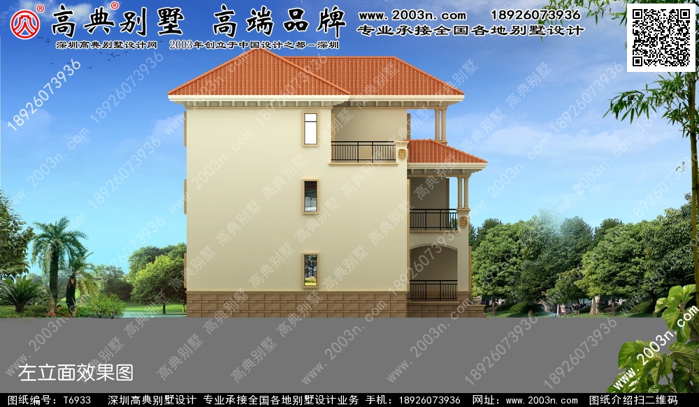 T6933号别墅外墙主要材料:天然岩石漆、天然砂岩石板材、天然砂岩石浮雕、310X310 S瓦、GRC水泥构件、铁艺栏杆