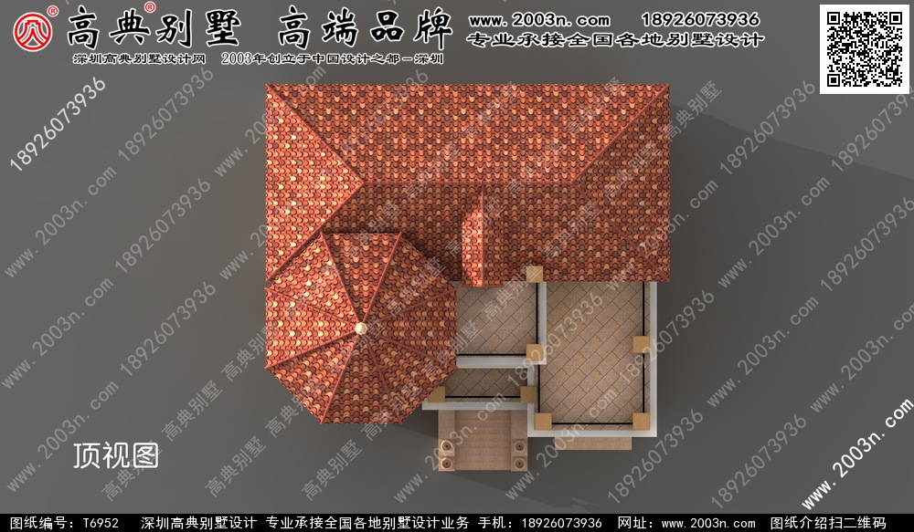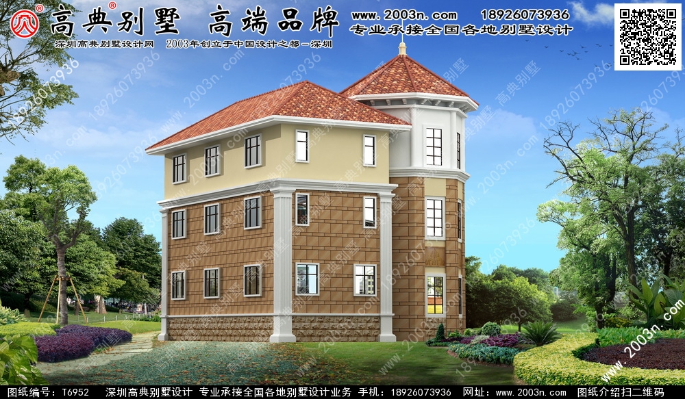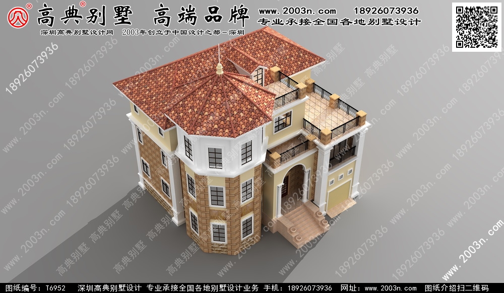 t6952号别墅外墙主要建筑材料:天然岩石漆、天然砂岩石、天然砂岩石浮雕、墙裙蘑菇石、310X310 S瓦、GRC水泥构件、铁艺栏杆