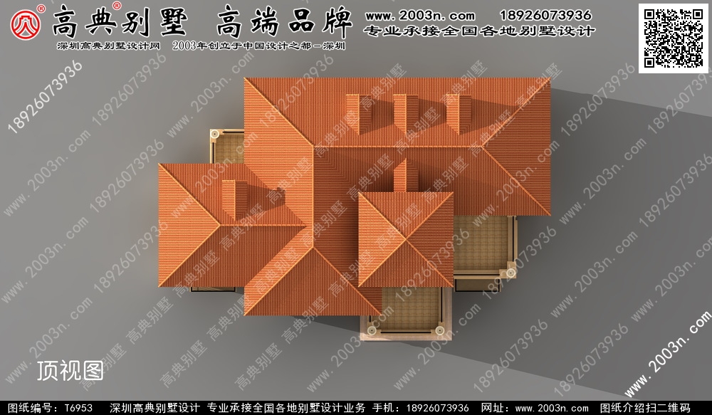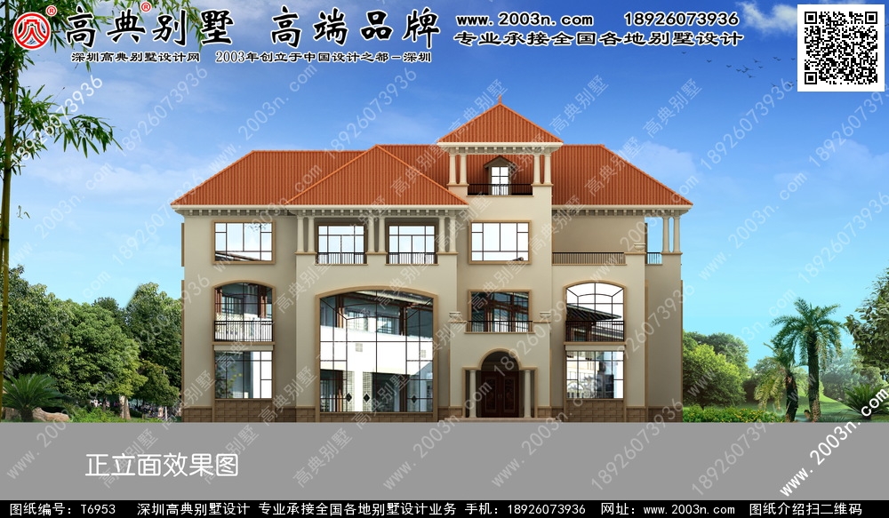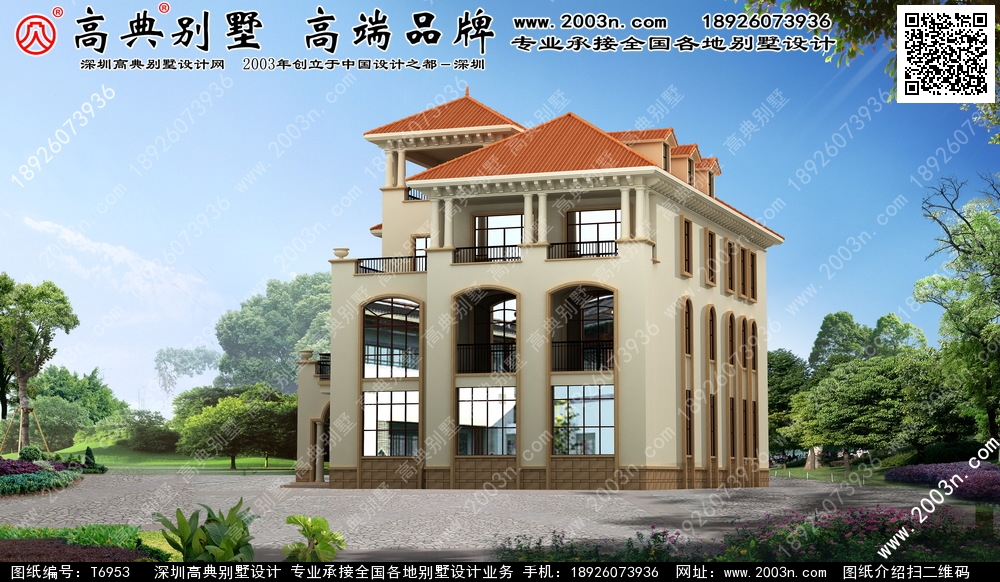 t6953号别墅外墙主要材料:外墙涂料、GRC水泥构件、西瓦、砂岩石