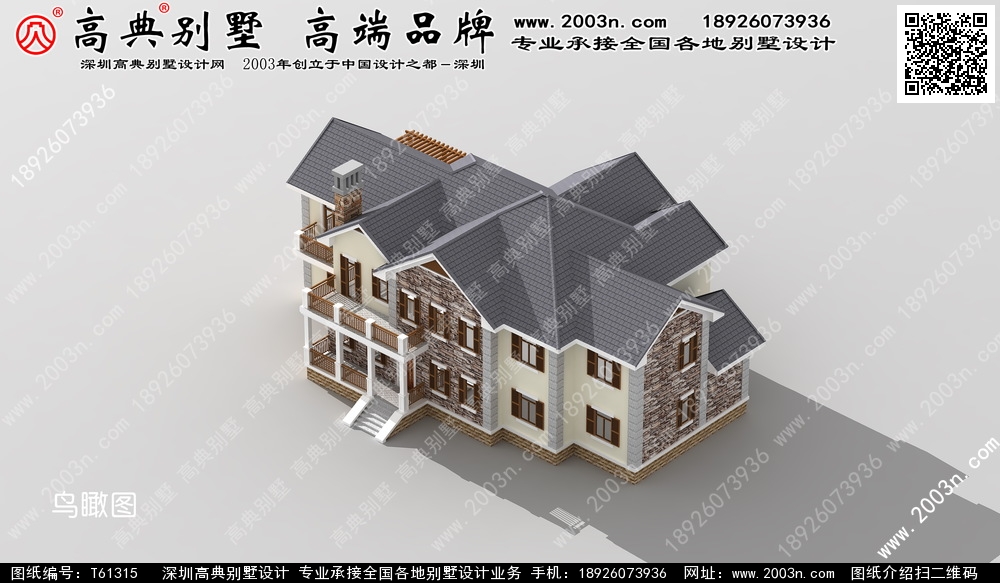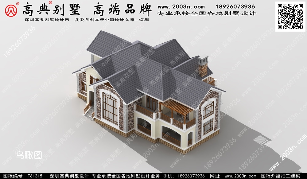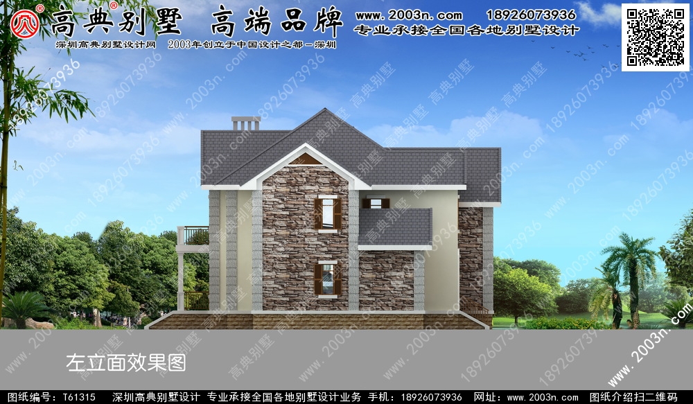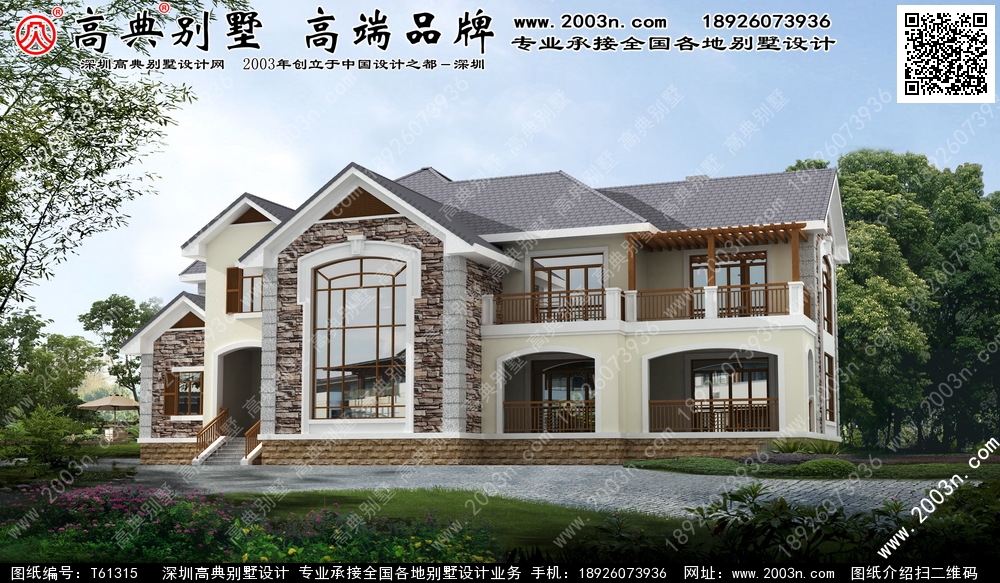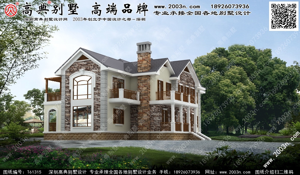 t61315号别墅外墙主要材料:天然岩石漆、包边装饰火烧面白麻石板材、屋面水泥平板瓦