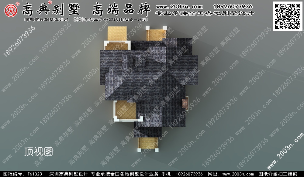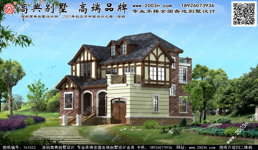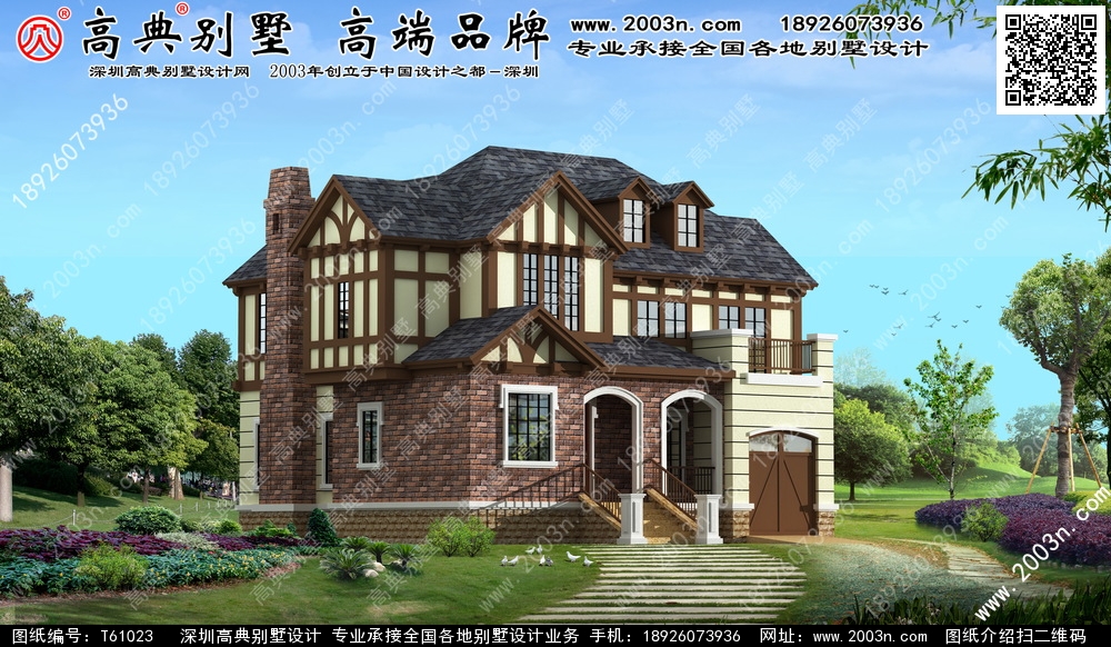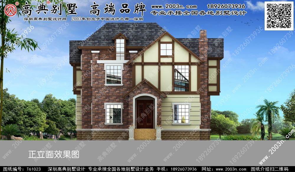 t61023号别墅外墙主要材料:天然岩石漆、红色劈开砖、玻纤瓦、墙裙磨菇石、铁艺栏杆