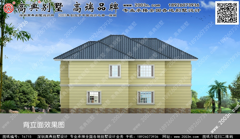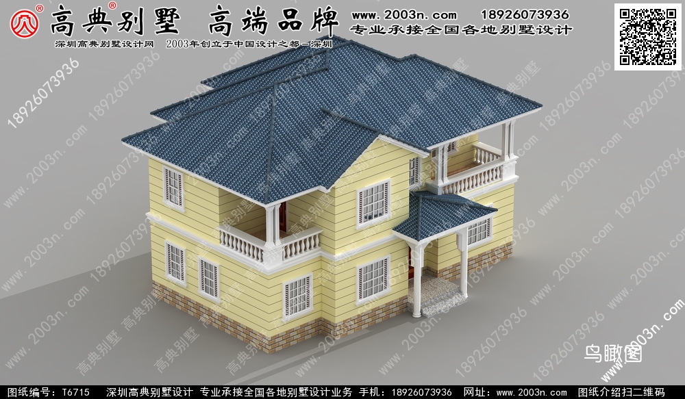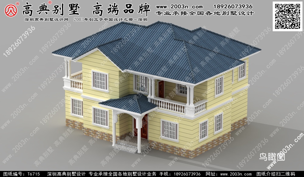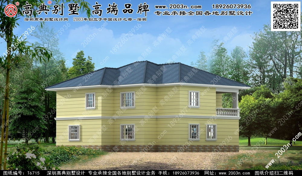t6715号别墅外墙主要材料:外墙真石漆、水泥构件葫芦柱栏杆、外墙砖、S瓦、水泥构件窗套
