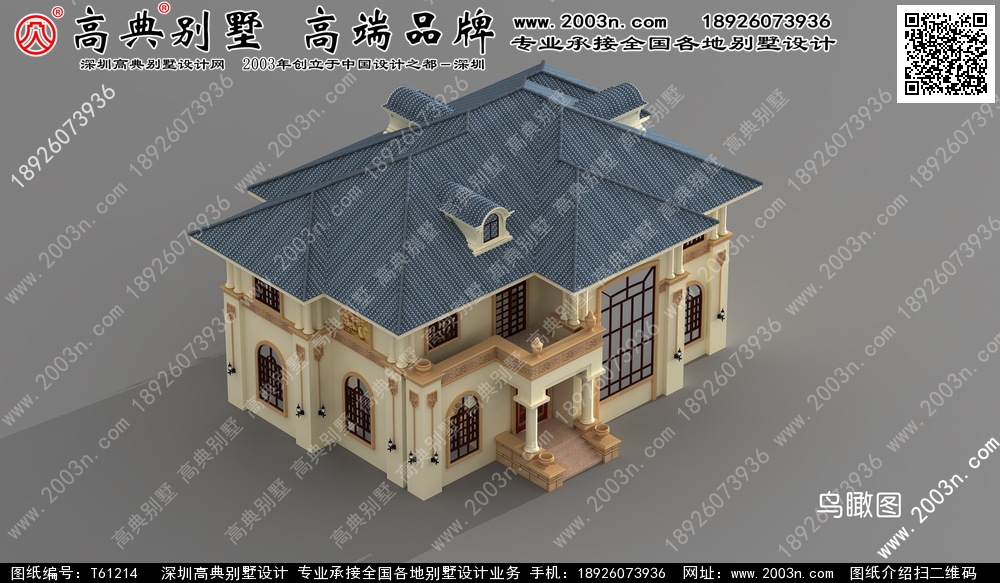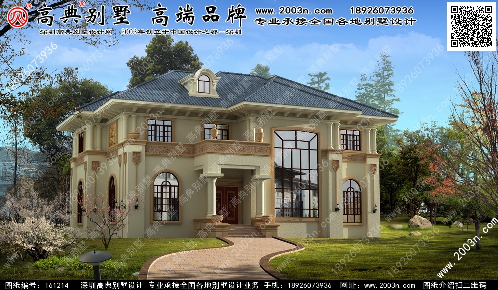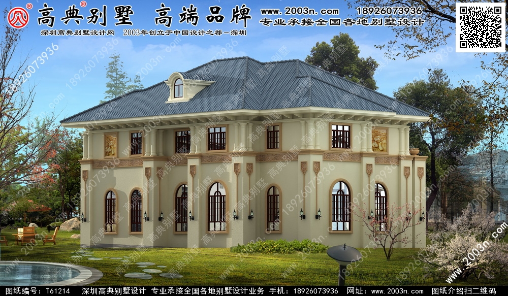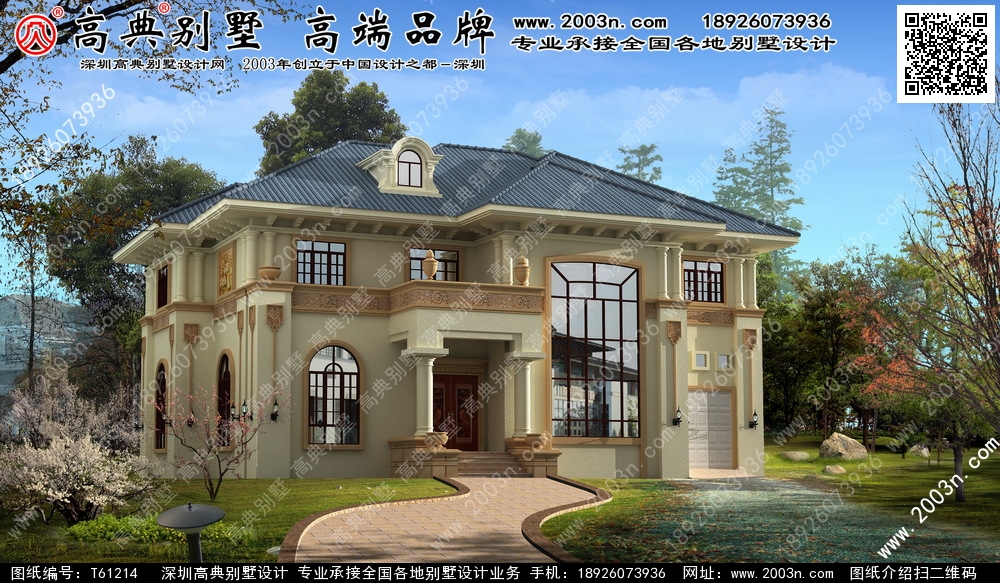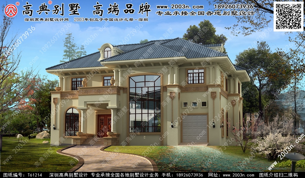 t61214号别墅外墙主要材料:外墙涂料、GRC水泥构件、西瓦、砂岩石、砂岩石浮雕