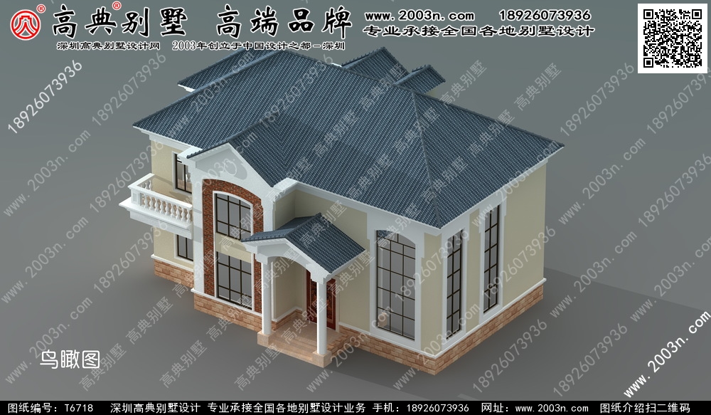 t6718号别墅外墙主要材料:外墙真石漆、水泥构件葫芦柱栏杆、外墙砖、S瓦、水泥构件窗套