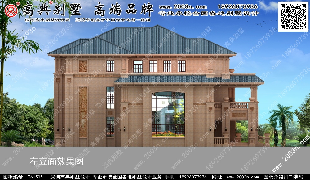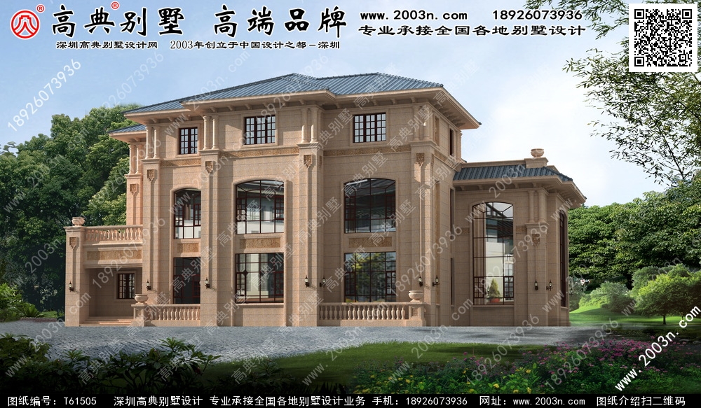 T61505号别墅外墙主要材料: 天然岩澳洲砂岩浮雕、外墙荔枝面沙漠棕石材、屋面310X310S瓦