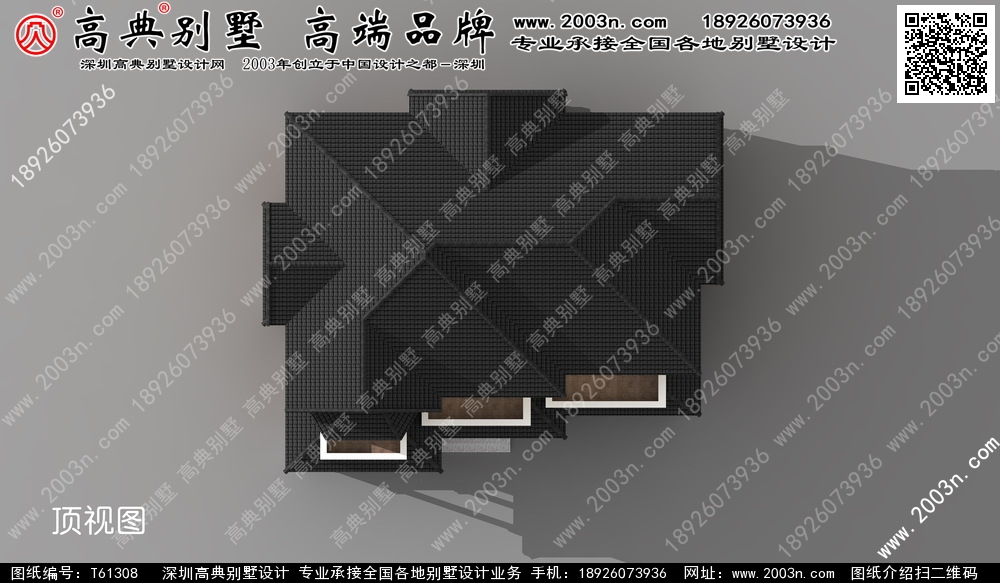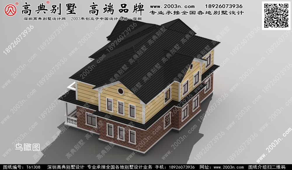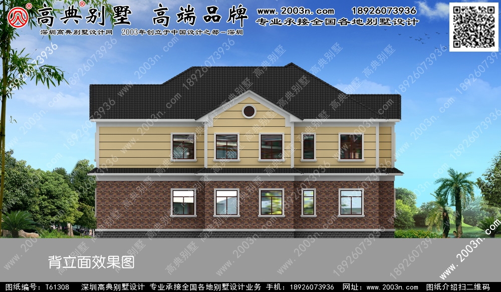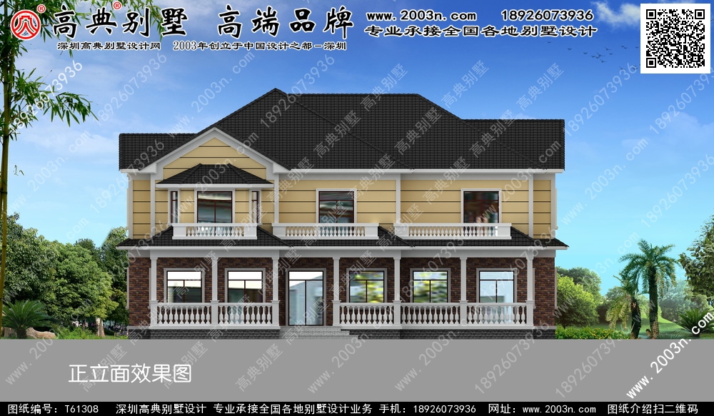 t61308号别墅外墙主要材料:外墙涂料、外墙文化砖、平板瓦、GRC水泥葫芦柱、150X300蘑菇石