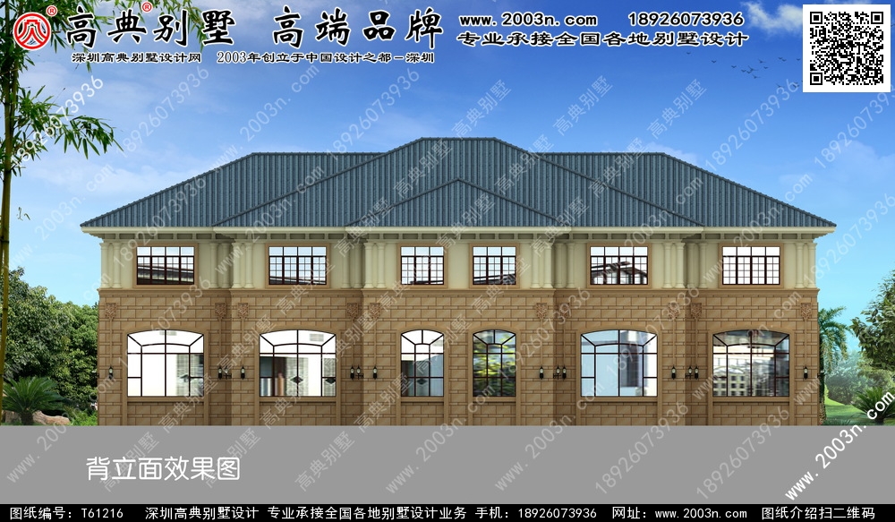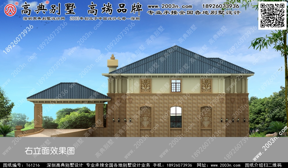 t61216号别墅外墙主要建筑材料:天然岩石漆、天然砂岩石、天然砂岩石浮雕、310X310 S瓦、GRC水泥构件、铁艺栏杆