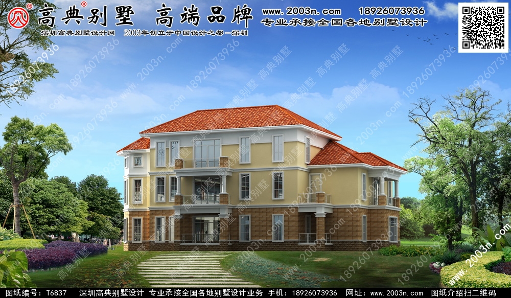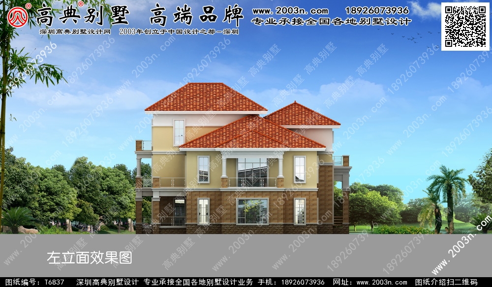 t6837号别墅外墙主要材料:天然岩石漆、天然砂岩石板材、不锈钢玻璃栏杆、310X310 S瓦