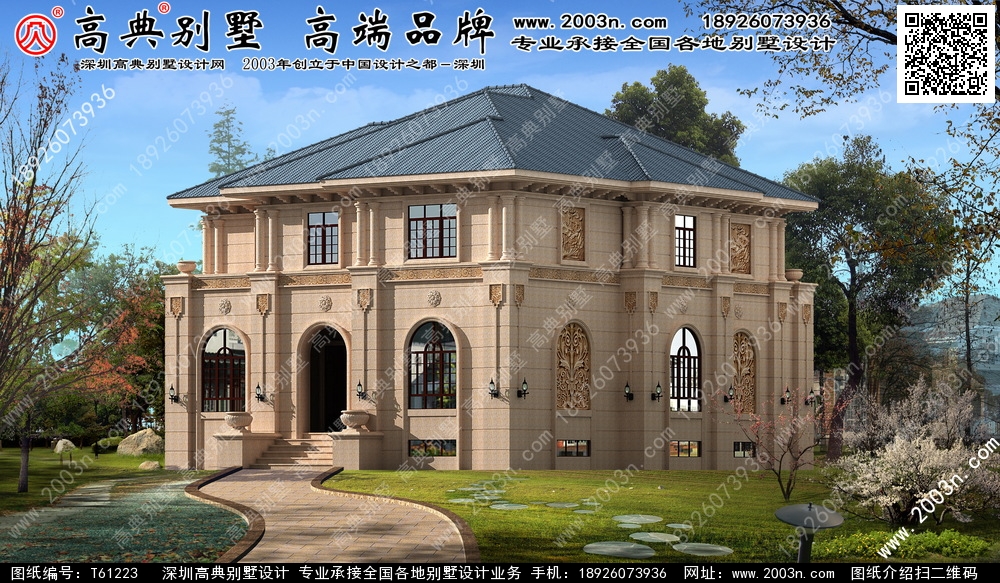 t61223号别墅外墙全部采用火烧面沙漠棕石材干挂、外墙纯石材别墅、屋面用310X310S瓦